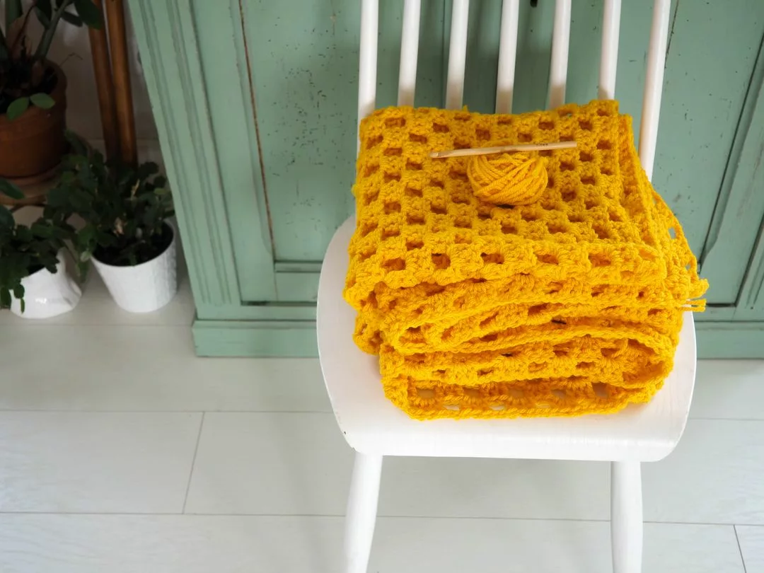 Ici, c’est un châle en granny triangulaire qui est en cours depuis quelques semaines, dans une couleur jaune curry. Je trouve que le jaune en automne donne du pep’s en tout cas 🙂