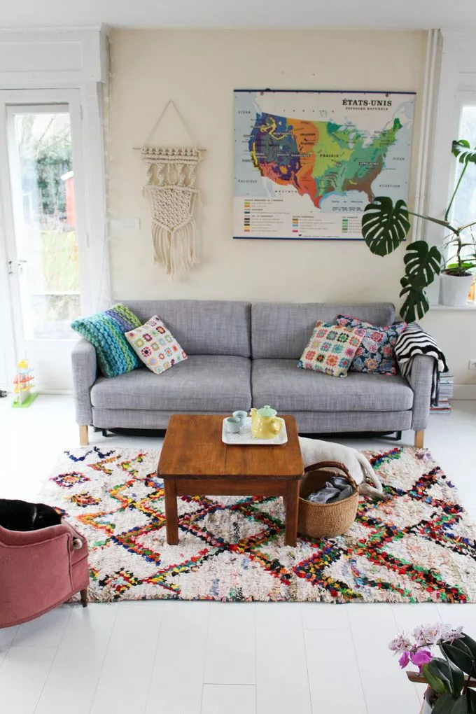 J’attendais de recevoir mon beau tapis acheté chez Bleu Berbère Bleu pour vous montrer notre nouveau salon. Un tapis berbère boucheroutte dont je rêvais, il fallait juste que je tombe sur celui qui ferait chavirer mon cœur <3 Celui-ci a une trentaine d’années, c’est fou, je l’adore. Un second tapis arrivera bientôt pour les mettre côte à côte. Au dessus du canapé, j’ai accroché une carte chinée sur une brocante et mon premier macramé.