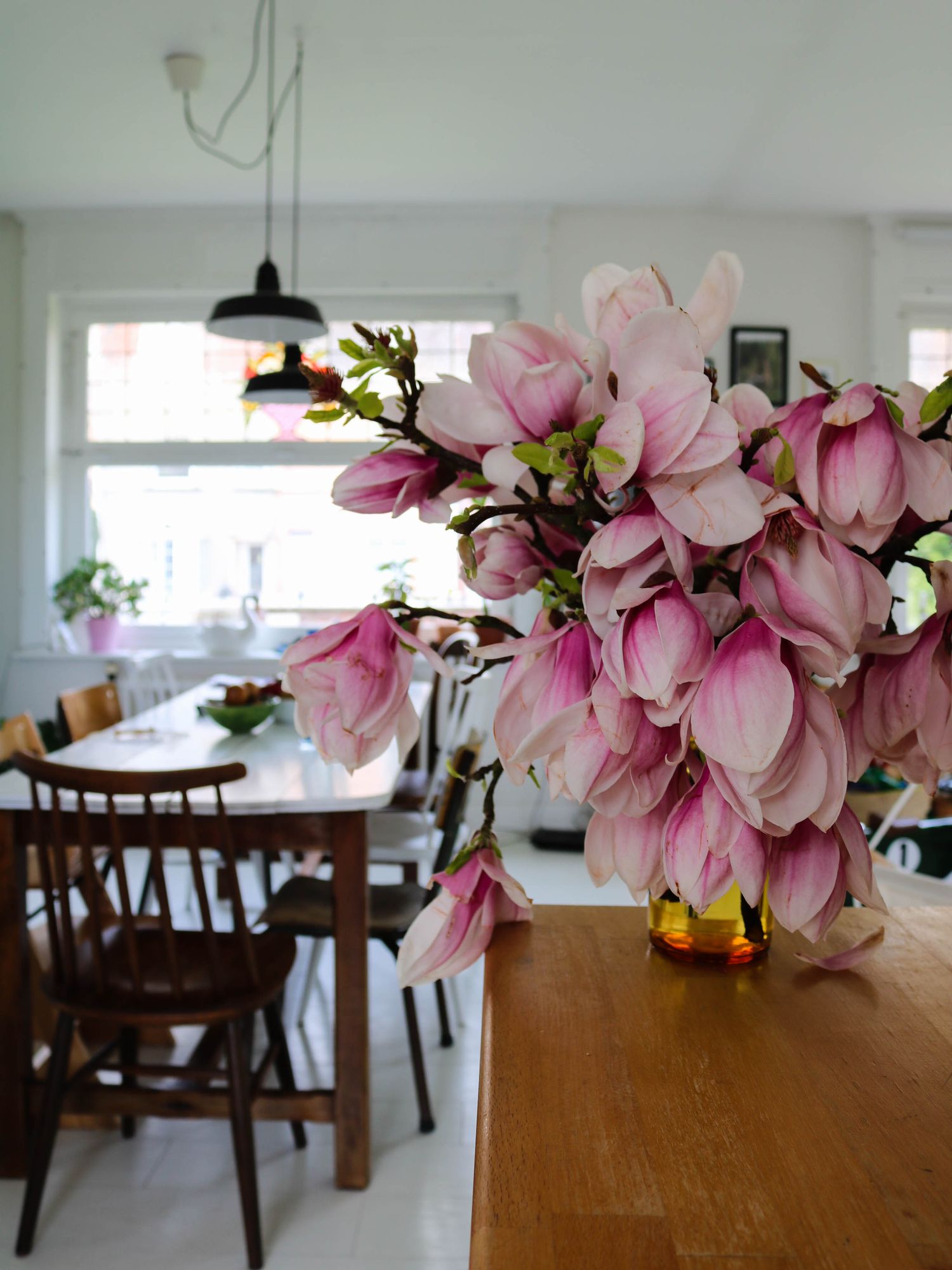Avril ici a éclaté. En une semaine nous sommes passés de l’hiver à l’été et la végétation ne s’est pas faite attendre pour exploser de partout. Ici dans le Nord comme à chaque printemps, les festivités ont démarré par le magnolia. Cet arbre qui est dans notre cours doit avoir 50 ans, il est immense et j’ai de la peine à grimper pour cueillir quelques branches, mais j’y tiens. Elles sont, avec les jonquilles et les hellébores, les premières fleurs du jardin. Et ce qui est chouette avec les photos c’est que je peux comparer les floraisons d’une année sur l’autre. Je me rappelle que mes grands-parents notaient tout dans leur agenda et je trouve cela très poétique.