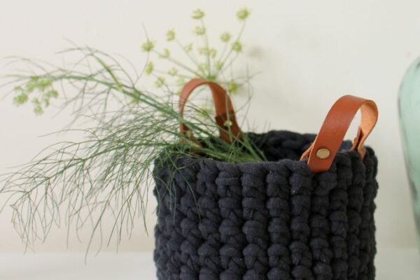 Rassembler 2 matières que j'aime : le cuir et le coton que je crochète, Pour créer des jolis petits paniers à trésors,  Trésors de bijoux, de plantes, de matériel[...]