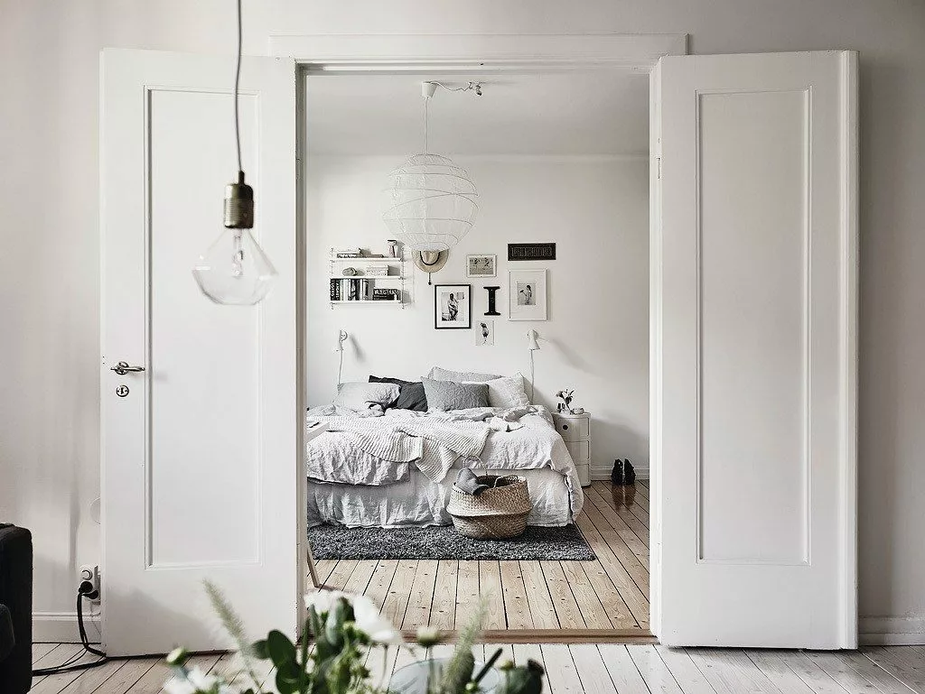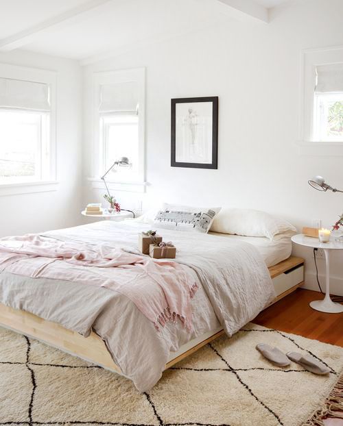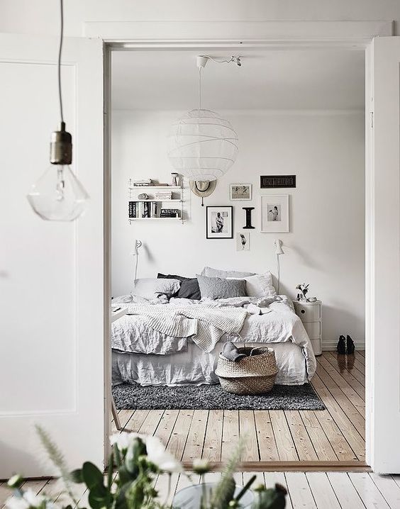 Et bien, après plusieurs mois d’épinglage acharné sur mon tableau “Chambre” , je me suis trouvée une ligne directrice: du blanc, une touche de noir pour effet très sobre ! Nous avons comme sol du parquet en pin tirant sur le jaune (comme sur la première photo ci-dessous et ça me démange de tout peindre en blanc!!!!) et les murs sont blancs. J’aimerai également changer de lit ou juste reprendre un nouveau sommier.