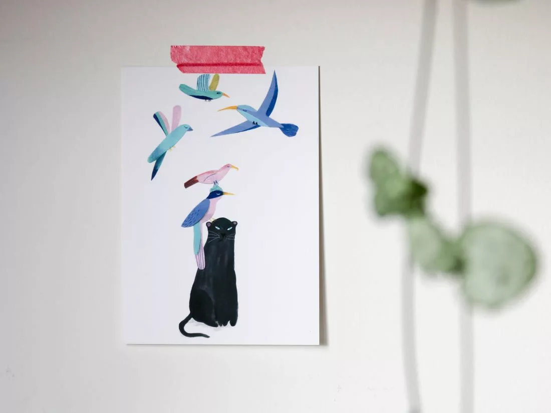 Tout d’abord il y a les jolies illustrations de La Petite Jungle. Derrière ce nom, il y a Laura dont l’univers doux, jungle et poétique me plait énormément. J’ai acheté son lot de 6 cartes postales que j’essaime dans la maison.