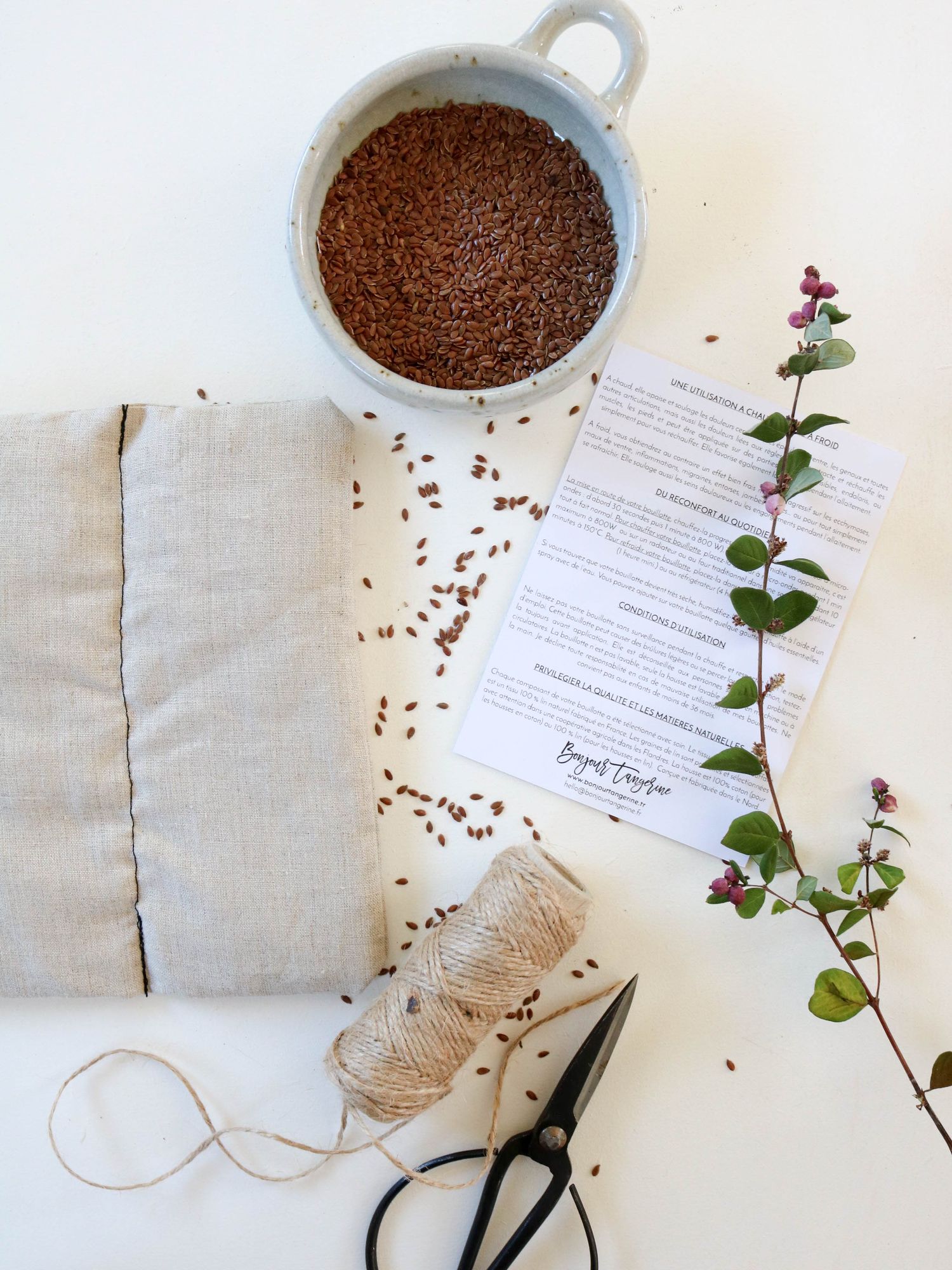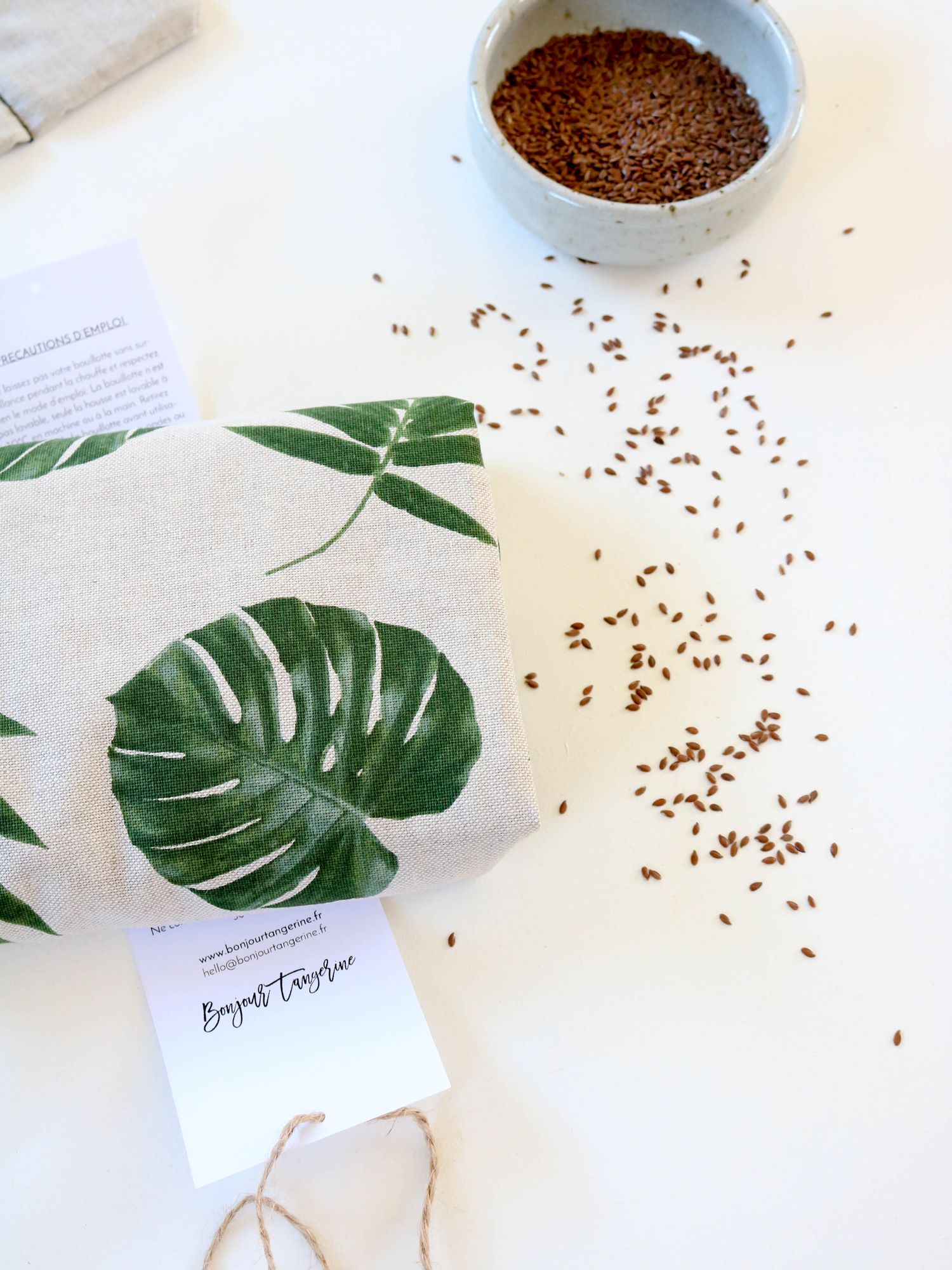 - le coussin contenant les graines de lin est en lin naturel non blanchi avec un tissu fabriqué en France.