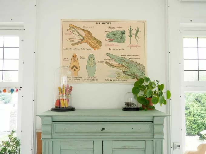 Après le coup de rafraichissement de peinture du rez-de-chaussée, le mur du buffet avait besoin d’une nouvelle touche déco. J’ai fait très simple: j’ai retourné mon affiche vintage de la poule pour laisser place aux lezards et autres bébêtes à sang froid. Ils sont moins glamours que ma poule mais ils passent très bien ici 😉