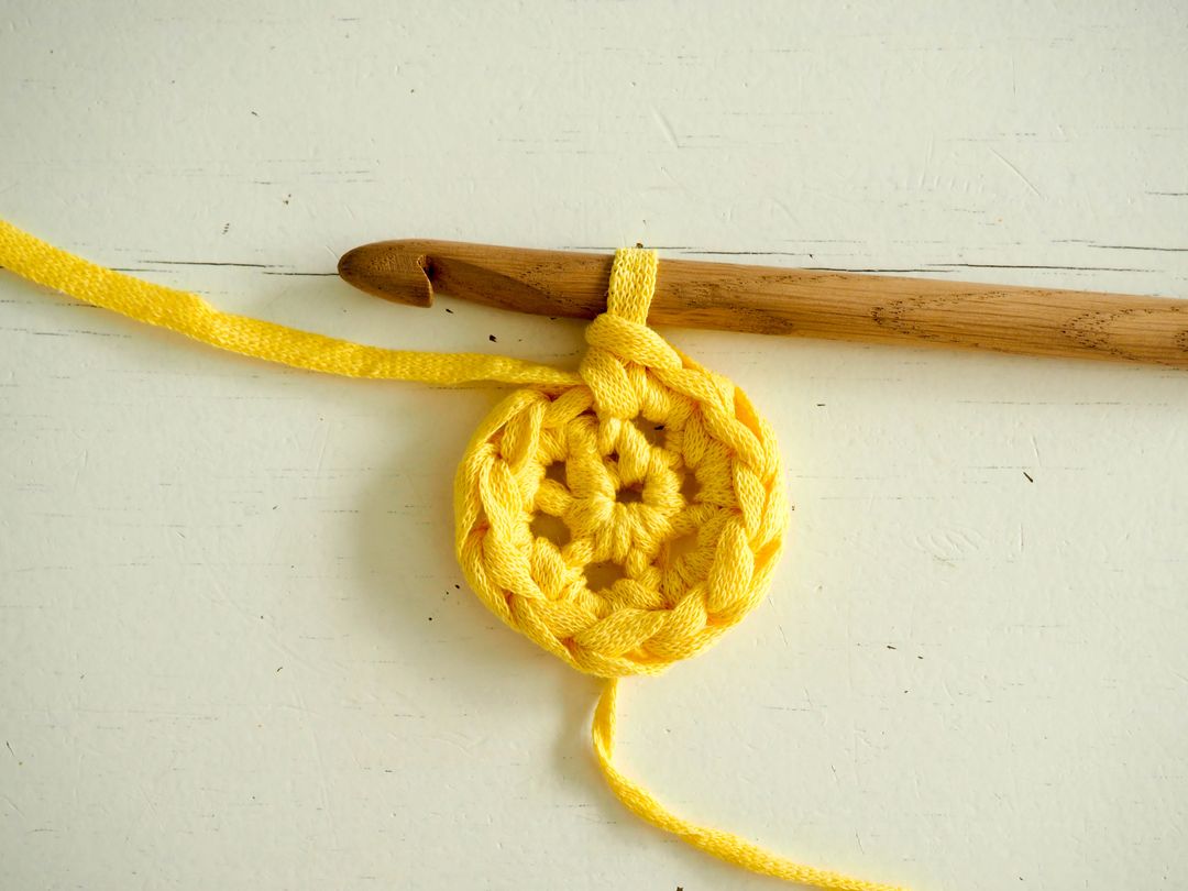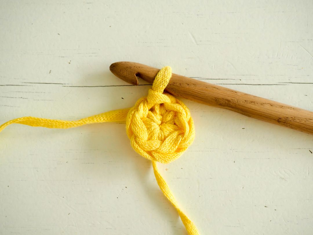 Faites un cercle magique (ou 5 mailles en l’air fermĂ©es par 1 maille coulĂ©e pour former un cercle).