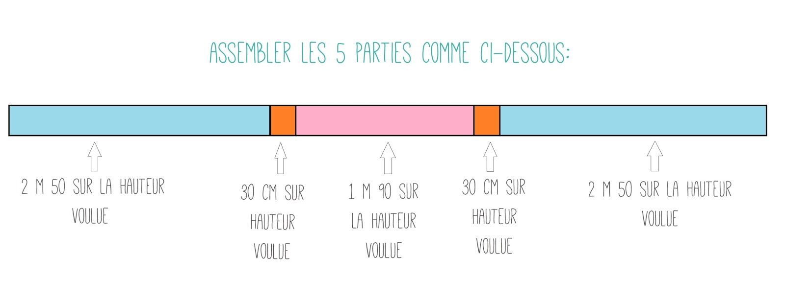 - Assembler tout d’abord la pièce de 2m50 (bleue, voir le schéma un peu plus bas) avec la pièce pour réaliser votre pli creux et celle de 1m90 (rose). N’assembler pas le reste pour le moment, cette étape va vous permettre d’ajuster la longueur de la pièce centrale (en rose). Réaliser le pli creux, j’ai utilisé ce tutoriel pour réaliser des plis creux. Lorsqu’il est terminé, placer le sur votre cadre de lit pour ajuster la longueur. Ajuster si nécessaire, puis former l’autre pli creux.