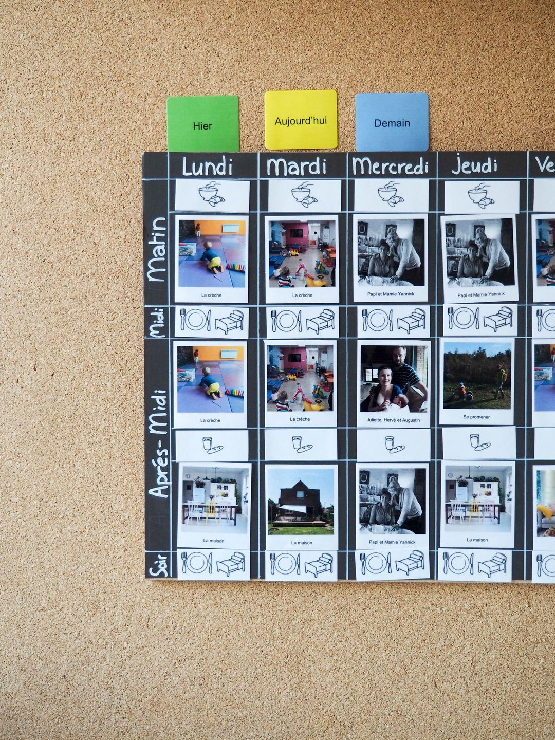 - des photos ( soit les faire imprimer par un spécialiste comme Cheerz, soit utiliser comme moi une plastifieuse), j’ai choisi des photos car elles sont plus concrètes. Les images pour les temps des repas et du repos ont été trouvées sur internet, je n’ai plus la source désolée…