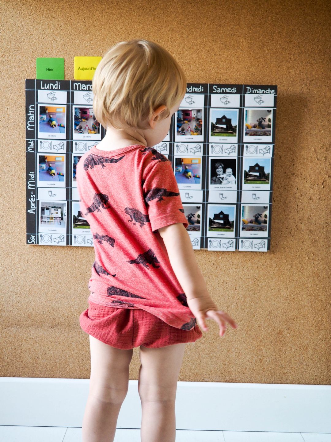 Loup étant de plus en plus intéressé par le temps et l’organisation de la semaine, je me suis penchée sur la réalisation d’une semainier. Je voulais qu’il soit: facile à réaliser, facile à comprendre, facile à utiliser au quotidien pour Loup/nous et surtout évolutif.