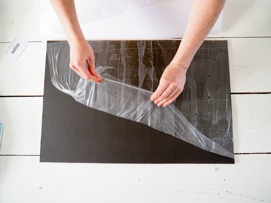 - Coller votre papier peint magnétique sur votre planche (propre et dépoussiérée): Décoller la pellicule siliconée blanche protégeant l’adhésif sur environ 5 cm. Appliquer la partie adhésive sur votre planche en partant du milieu vers l’extérieur et retirer doucement la pellicule siliconée tout en continuant de chasser l’air avec la carte rigide. N’exercez pas de tension sur le papier peint. Attendre ensuite 48 heures avant de l’utiliser. Vous pouvez visionner cette étape sur le site de Ferflex.