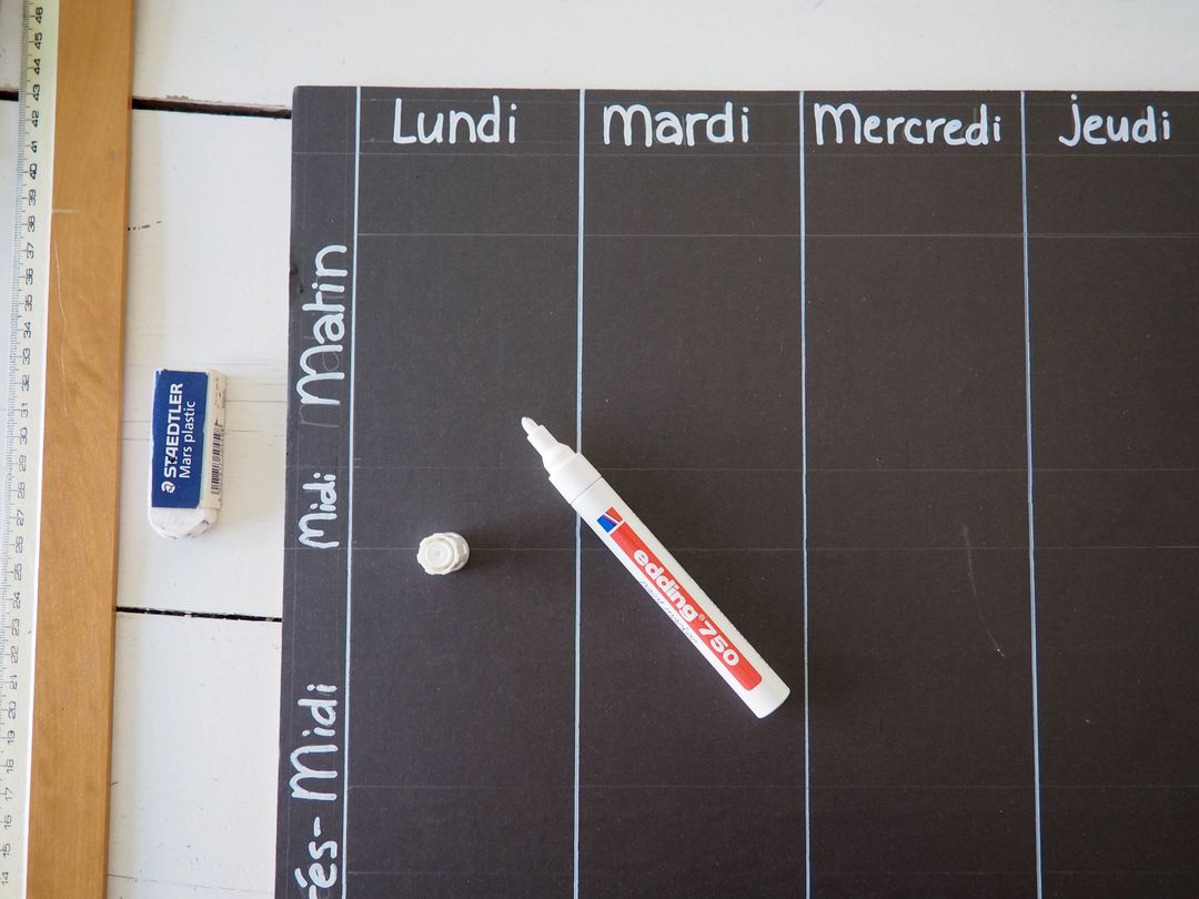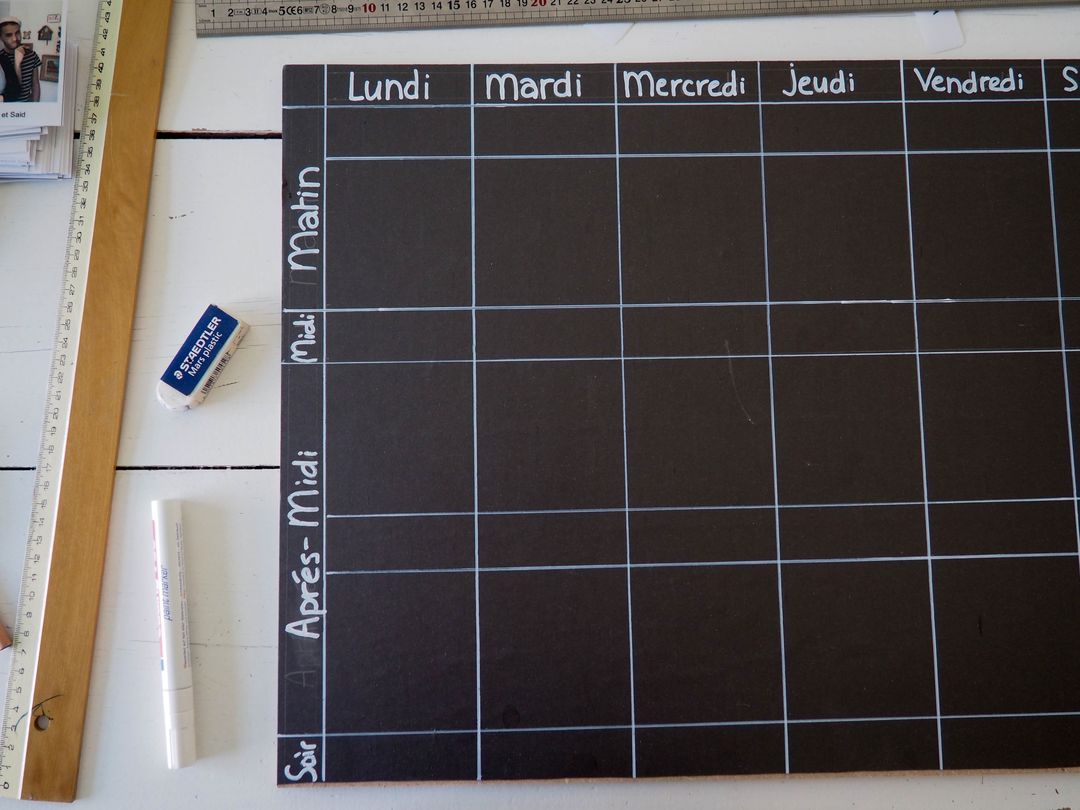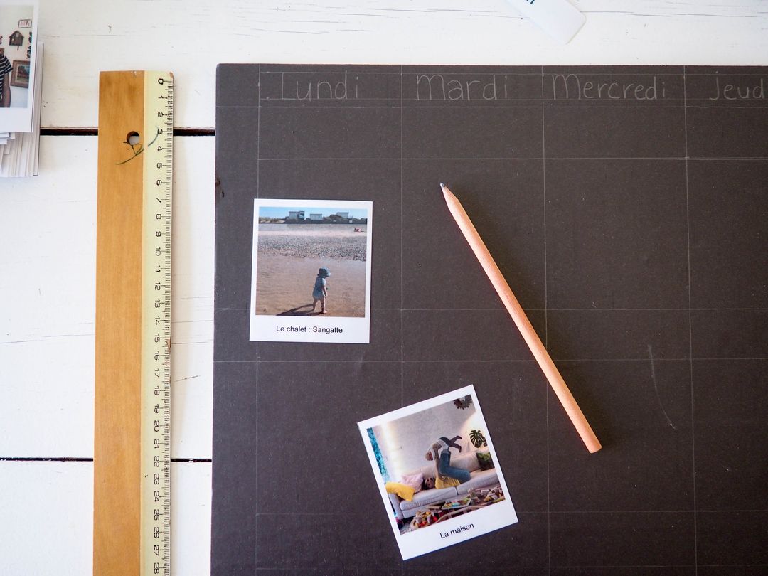 - Dessiner votre semainier au crayon de papier, je me suis aidée du gabarit des photos et des images préalablement plastifiées. Puis repasser sur les traits avec un marqueur blanc.