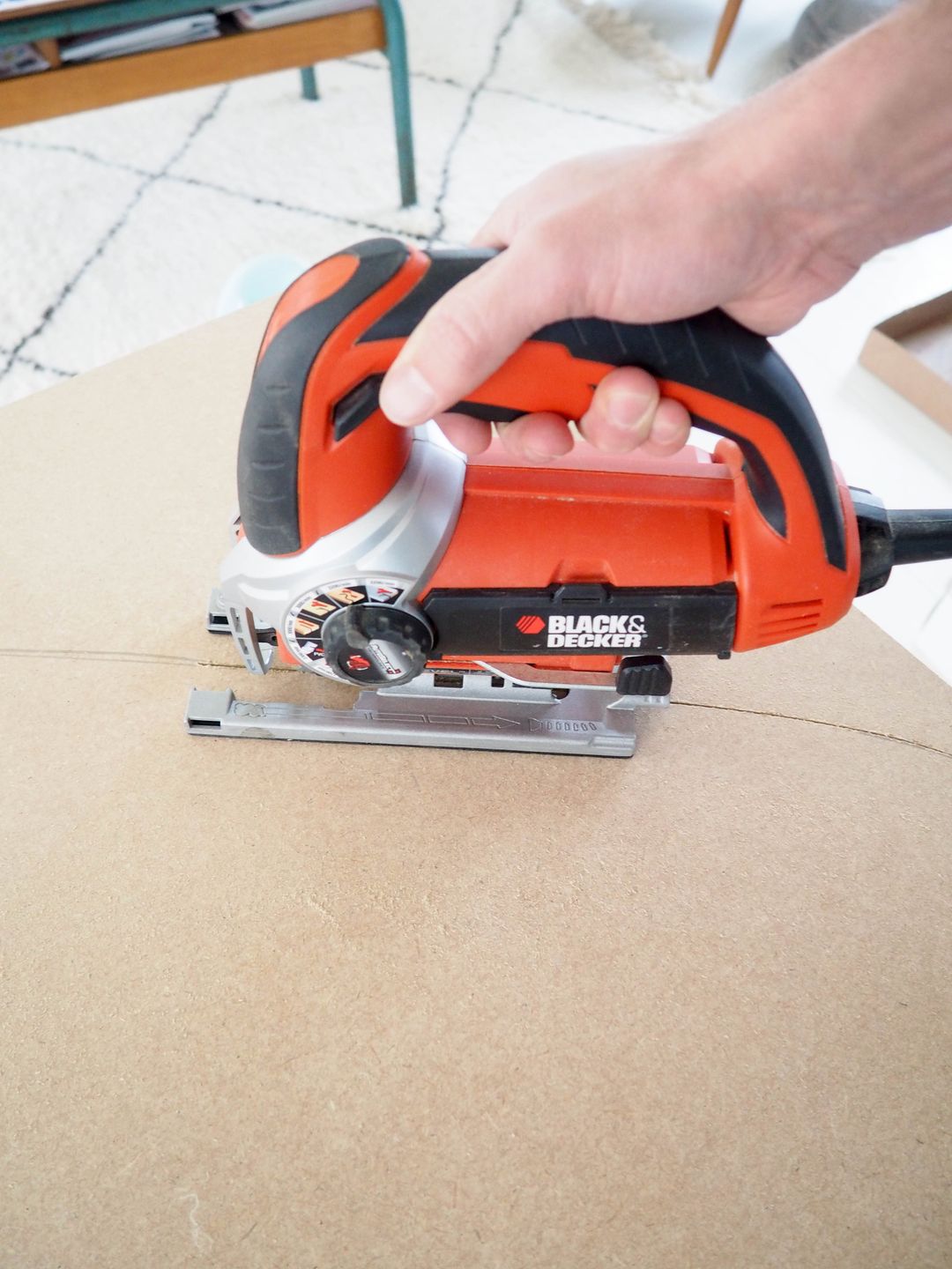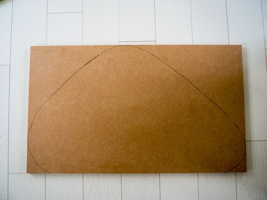 J’ai tracé à l’aide de mon patron la forme à découper sur le panneau en médium. Puis Chéri l’a découpé à la scie sauteuse.