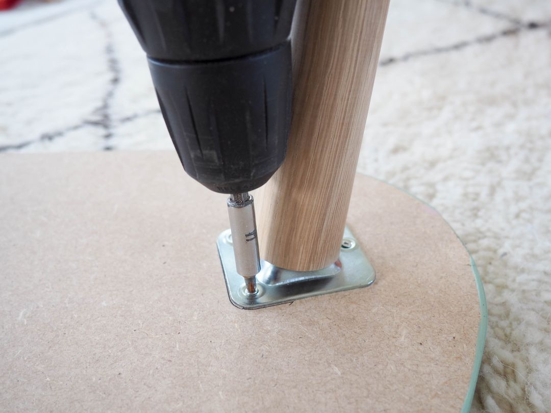 Nous avons ensuite installé les pieds compas en les fixant à 5 cm du bord de la table avec une viseuse.