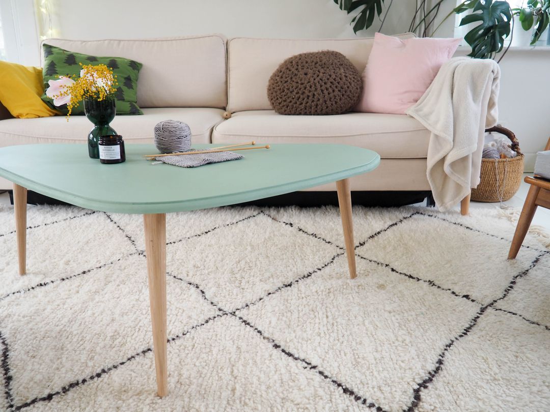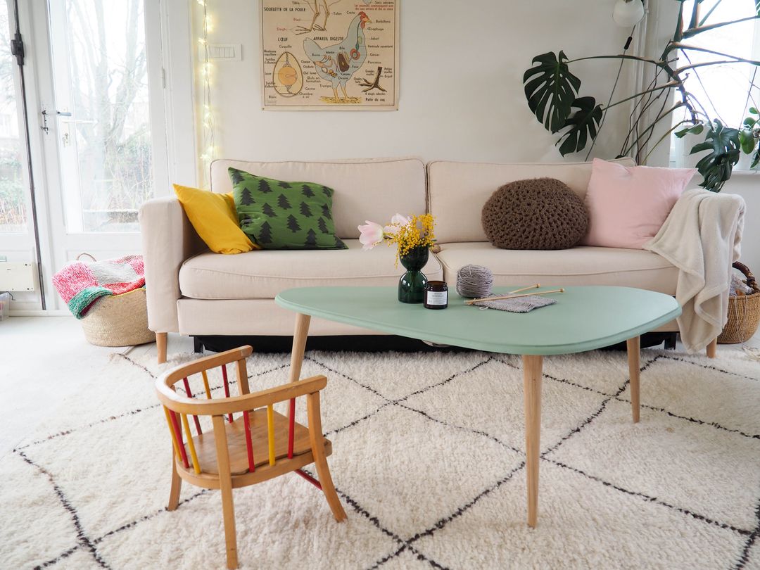 Et tadam! Une jolie table basse vintage avec de superbes pieds. Et le principal intéressé, Loup, passe des heures à dessiner en étant assis confortablement. Je peux aussi ranger un pouf en cuir en dessous !