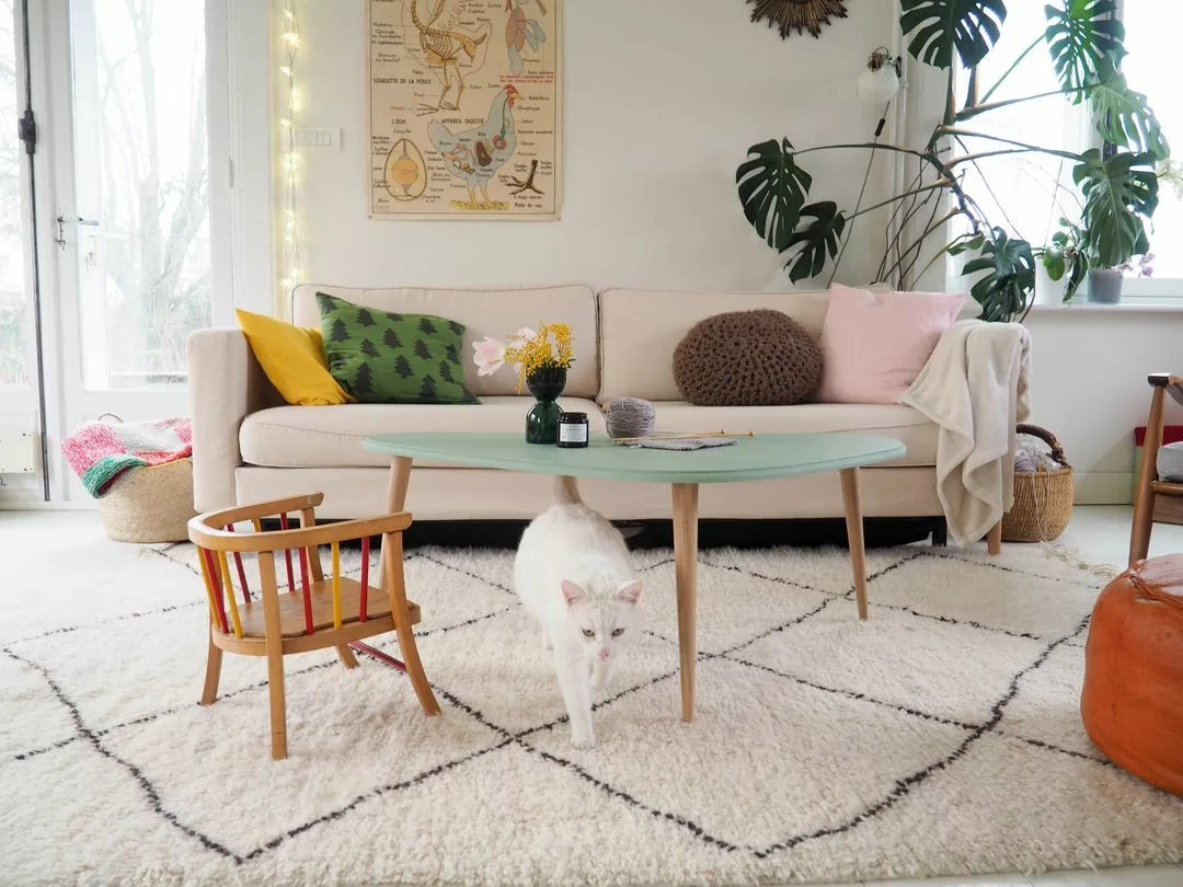Tapis Beni Ouaraim de Bleu Berbère Bleu – Affiche Poule de Perles de Chine – Chat trouvé dans le jardin – Housse de canapé Comfort Works – Canapé Ikea modèle Karlstad