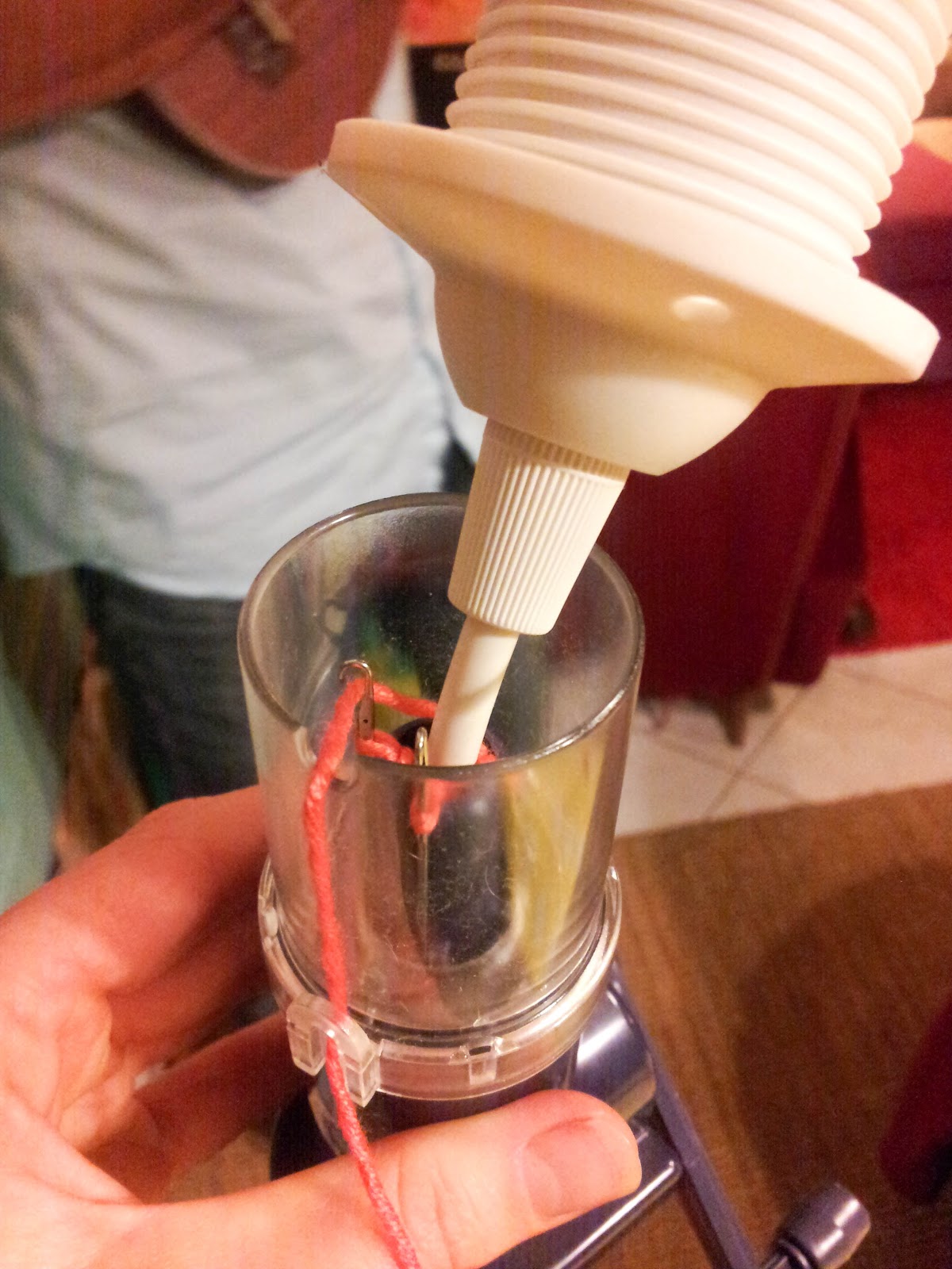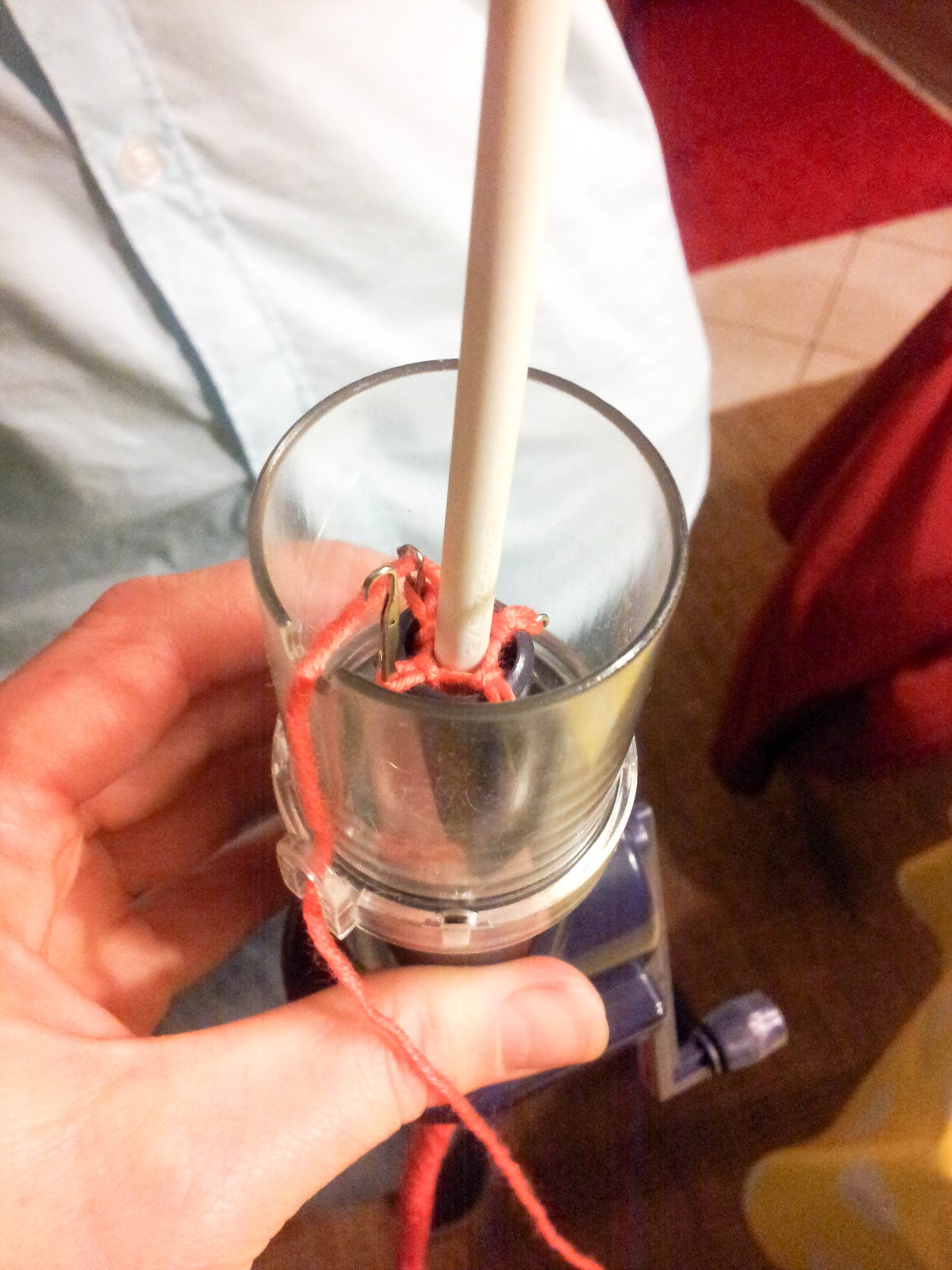 2. Enfiler le câble dans le tricotin et demandez à un ami/amie de vous aider car le tricotin tourne et il faut tourner le câble en même temps. J’ai essayé toute seule (vous allez vous énerver…pour rien).