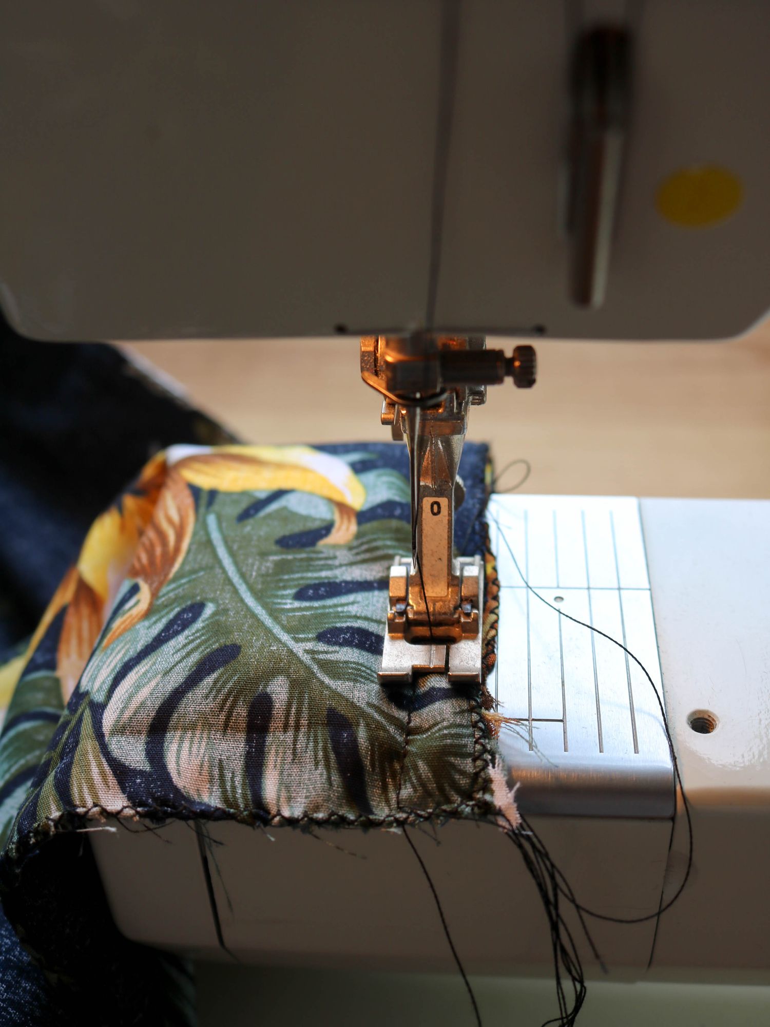 - Pour commencer, surfilez le tour de votre tissu : soit à la surjeteuse soit avec un point zig-zag à cheval sur les bords. Cela évite au tissu de s’effilocher et donne une jolie finition.