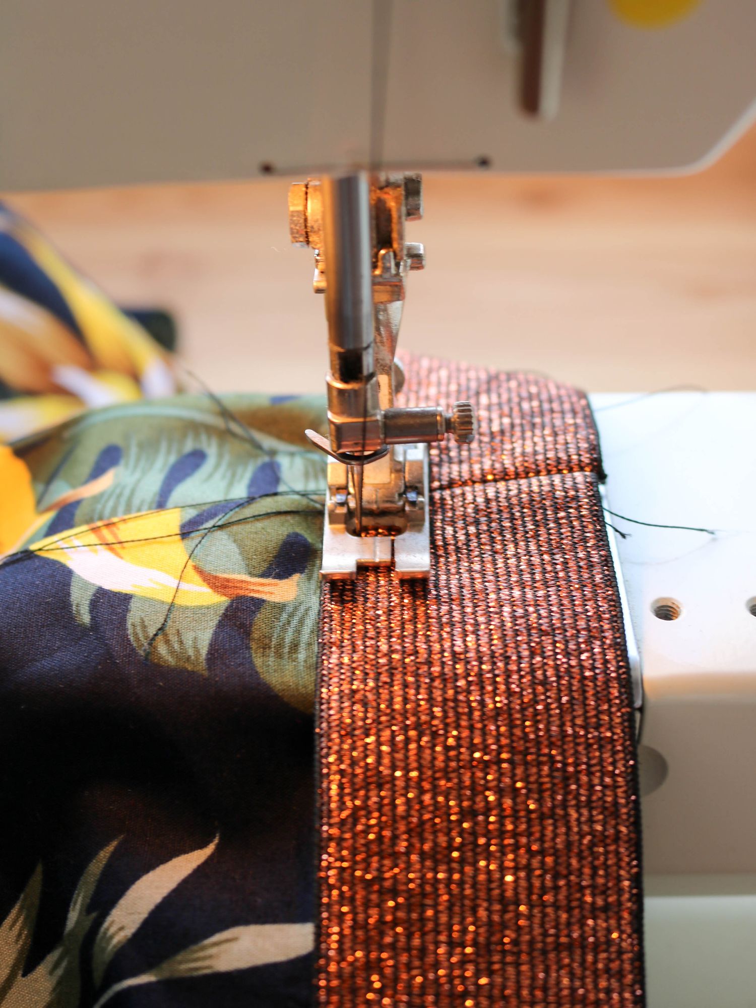 J’ai choisi 2 popelines de coton : celle-ci à grosses fleurs jaunes et celle-ci à fleurs . La ceinture de la jupe est cet élastique cuivré tellement joli qui se décline aussi en doré et argenté.