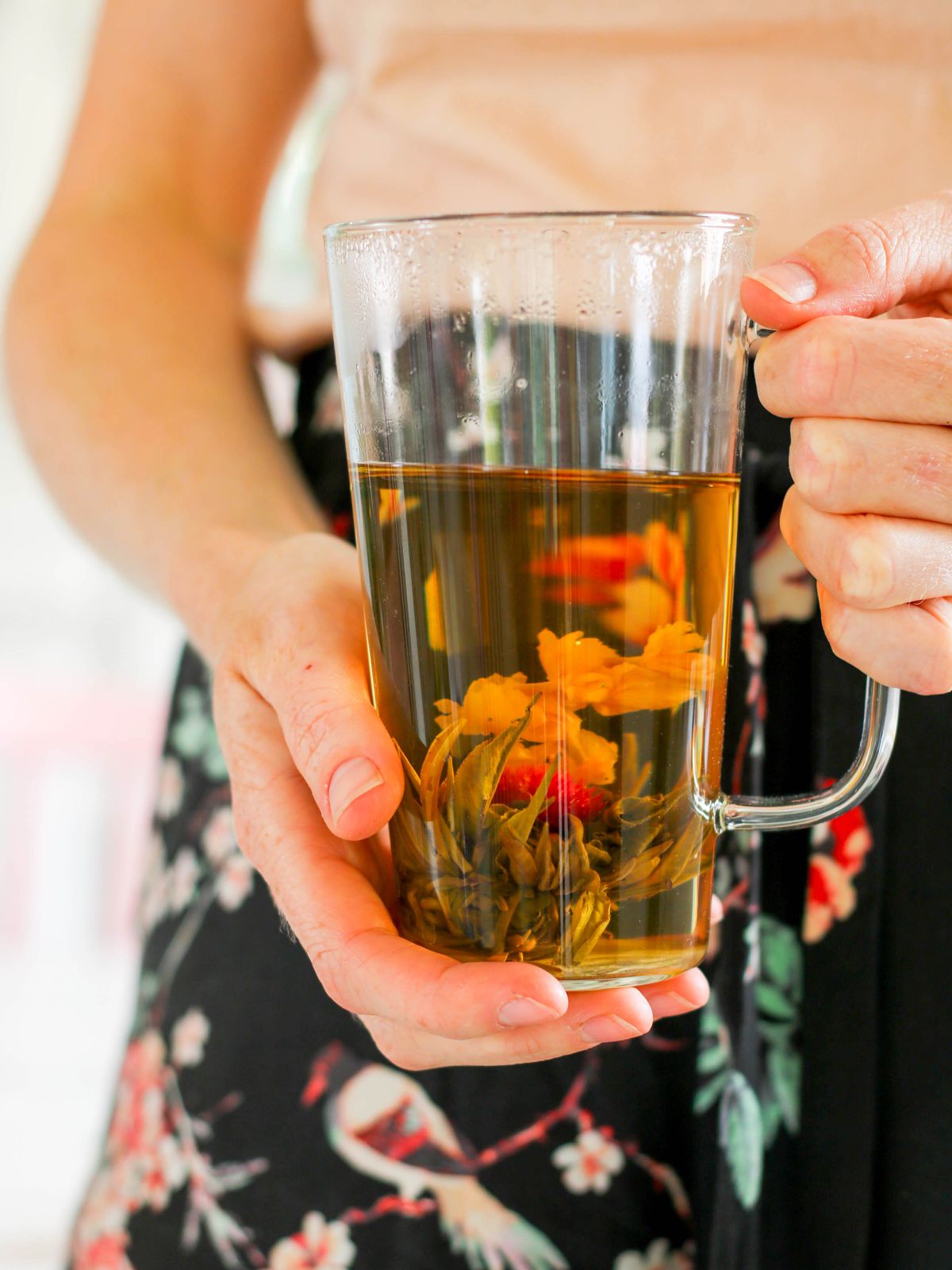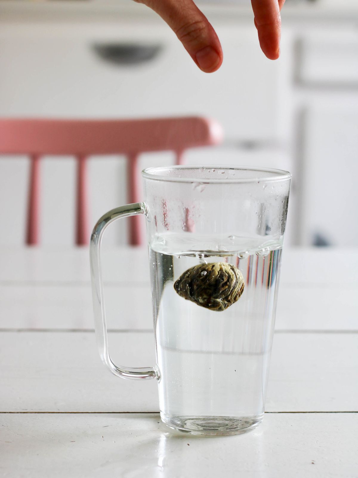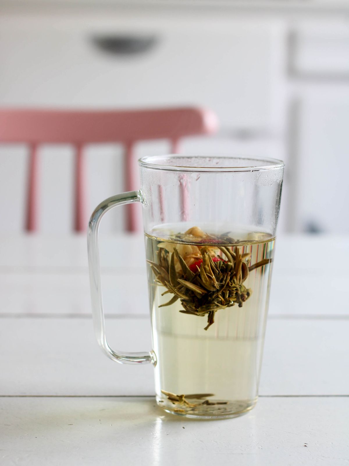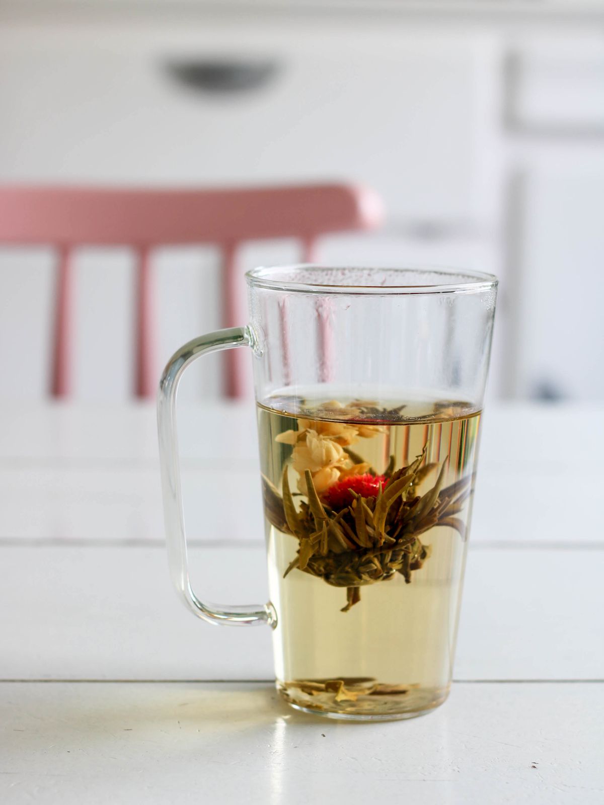 J’ai testé la fleur de thé de Souci et jasmin, après avoir fait frémir mon eau, je la verse dans le mug ou une théière (transparents c’est mieux) puis je laisse tomber la fleur. Le mug en verre de 50 cl est d’ailleurs idéal pour assister au spectacle de la fleur de thé.
