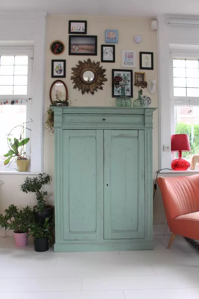 Le rendu est superbe ! La couleur vert amande est très belle. Le fauteuil que l'on aperçoit, orange (?), tu l'as chiné ?