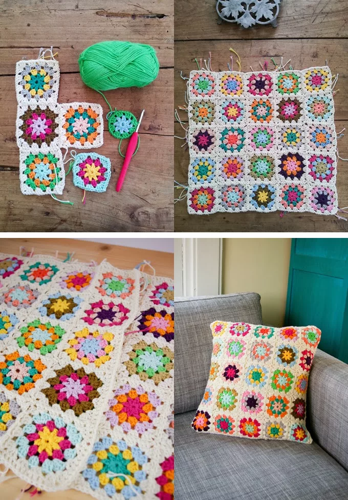 Parmi mes ouvrages de cet été voici mes deux housses de coussin au crochet. Après des heures de boulot à réaliser des petits carrés dans la voiture à l’aller, sur la terrasse, au bord de la rivière, dans la cuisine etc… je les avais laissés de côté depuis.