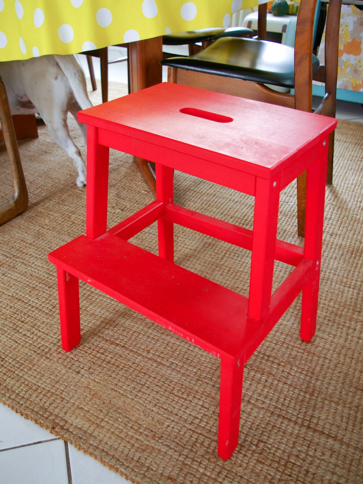 Ni une, ni deux, après un passage dans mon magasin de bricolage, j’ai entamé le changement de couleur de mon tabouret Ikea.