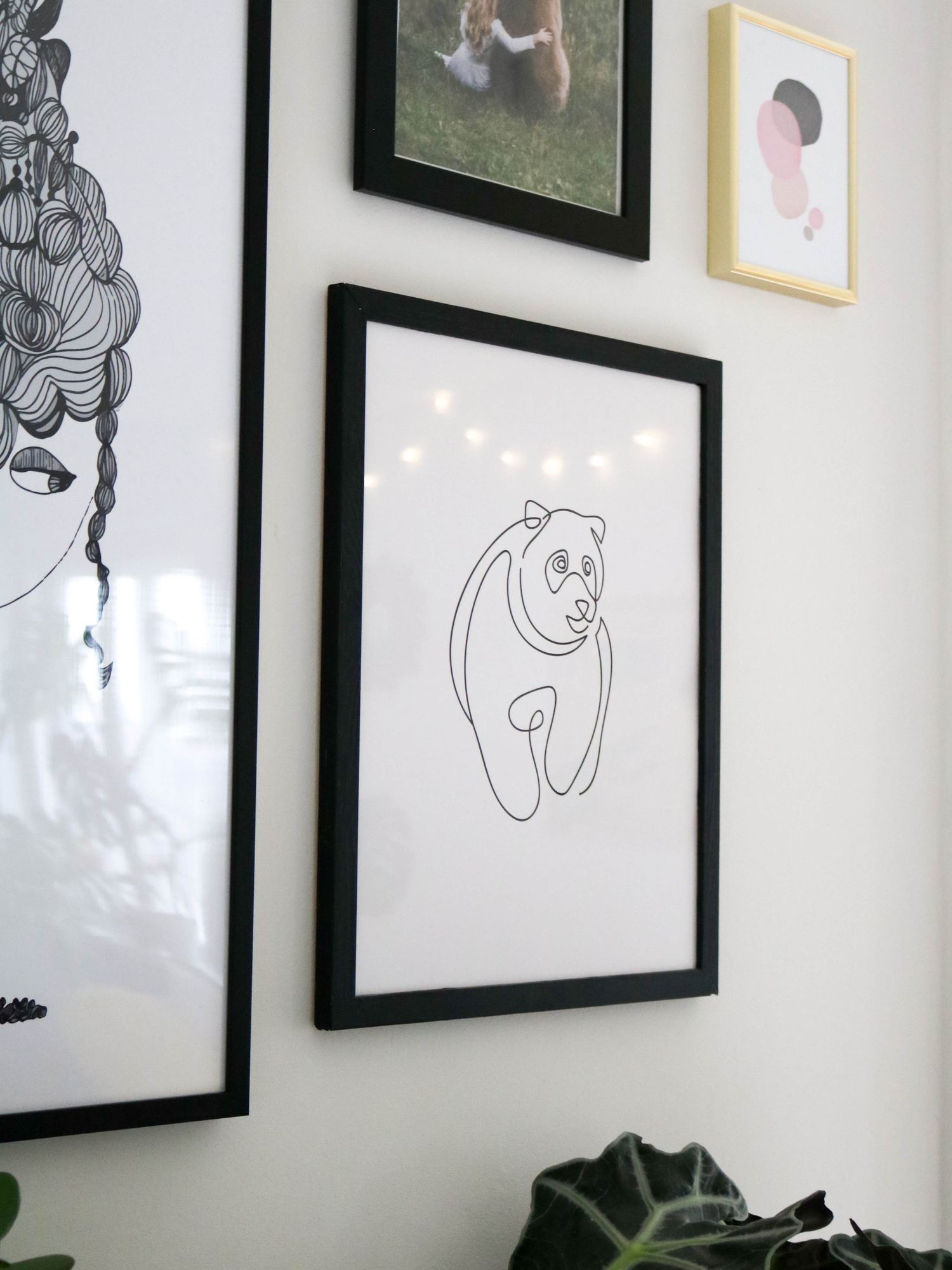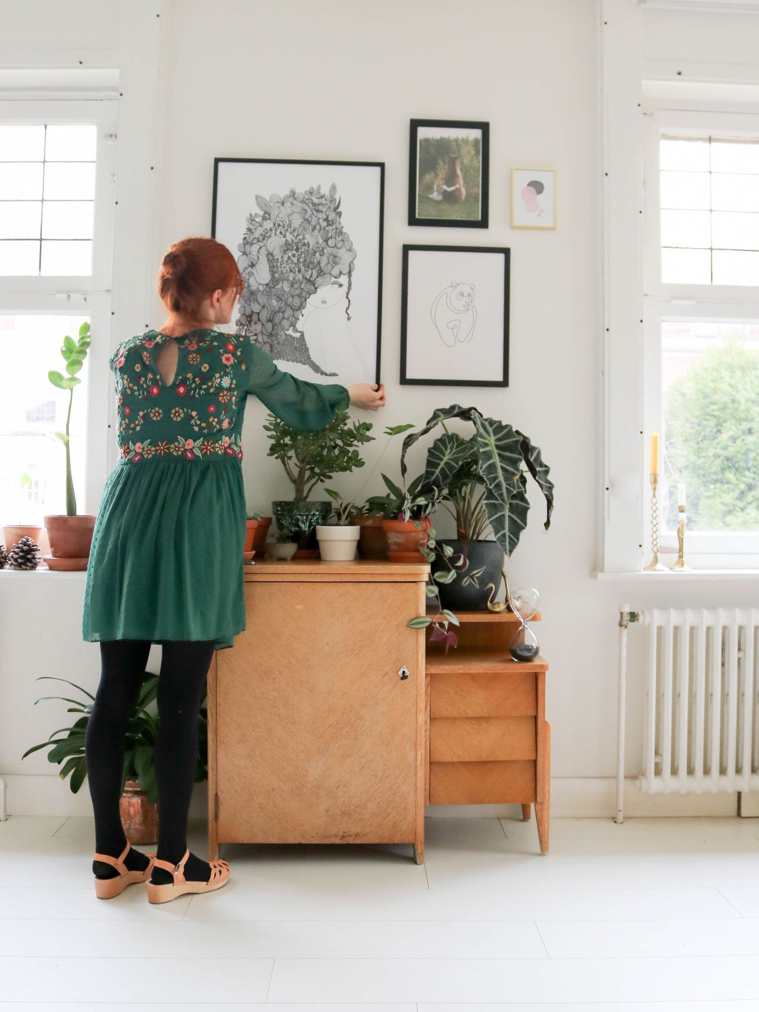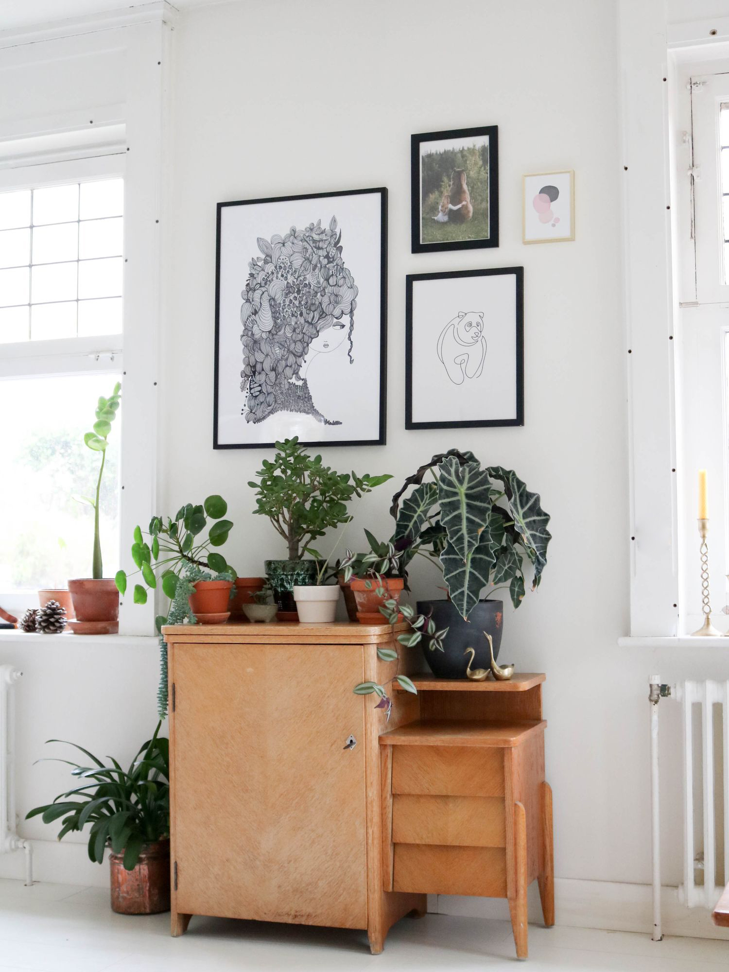 Après avoir installé ce petit meuble de couture vintage entre nos deux grandes fenêtres, j’ai disposé mes plantes préférées: la pilea peperomiodes, l’arbre de jade ou l’alocacia amazonica. Il restait le mur à décorer, une chose était sûre: je voulais y mettre des cadres. Moins qu’avant mais des pièces choisies pour longtemps et qui peuvent migrer facilement d’une pièce à une autre.
