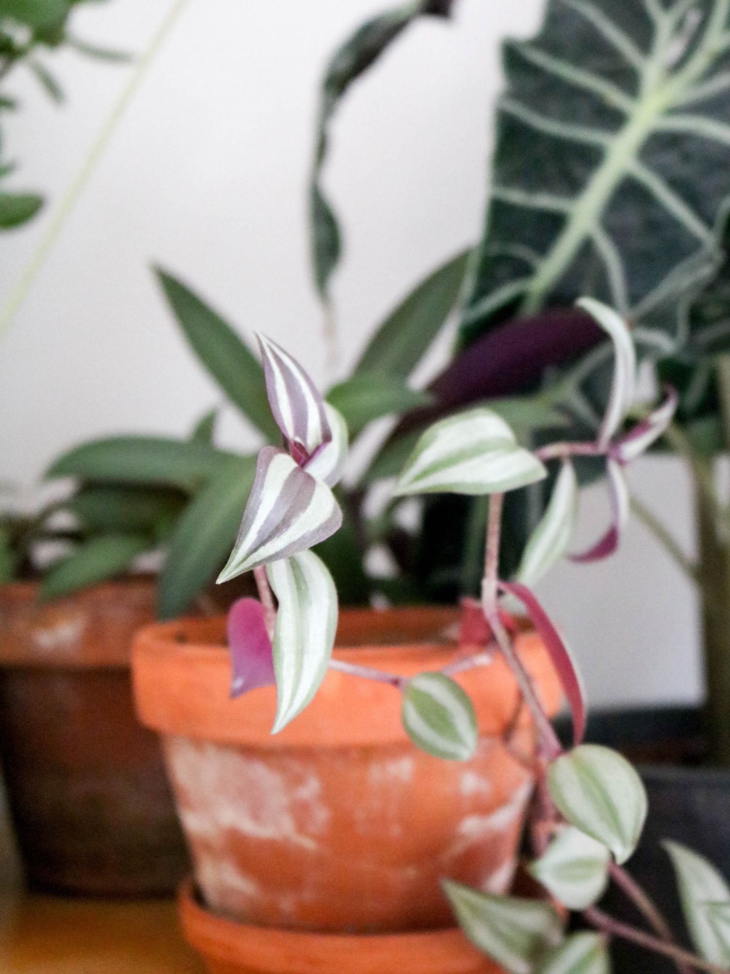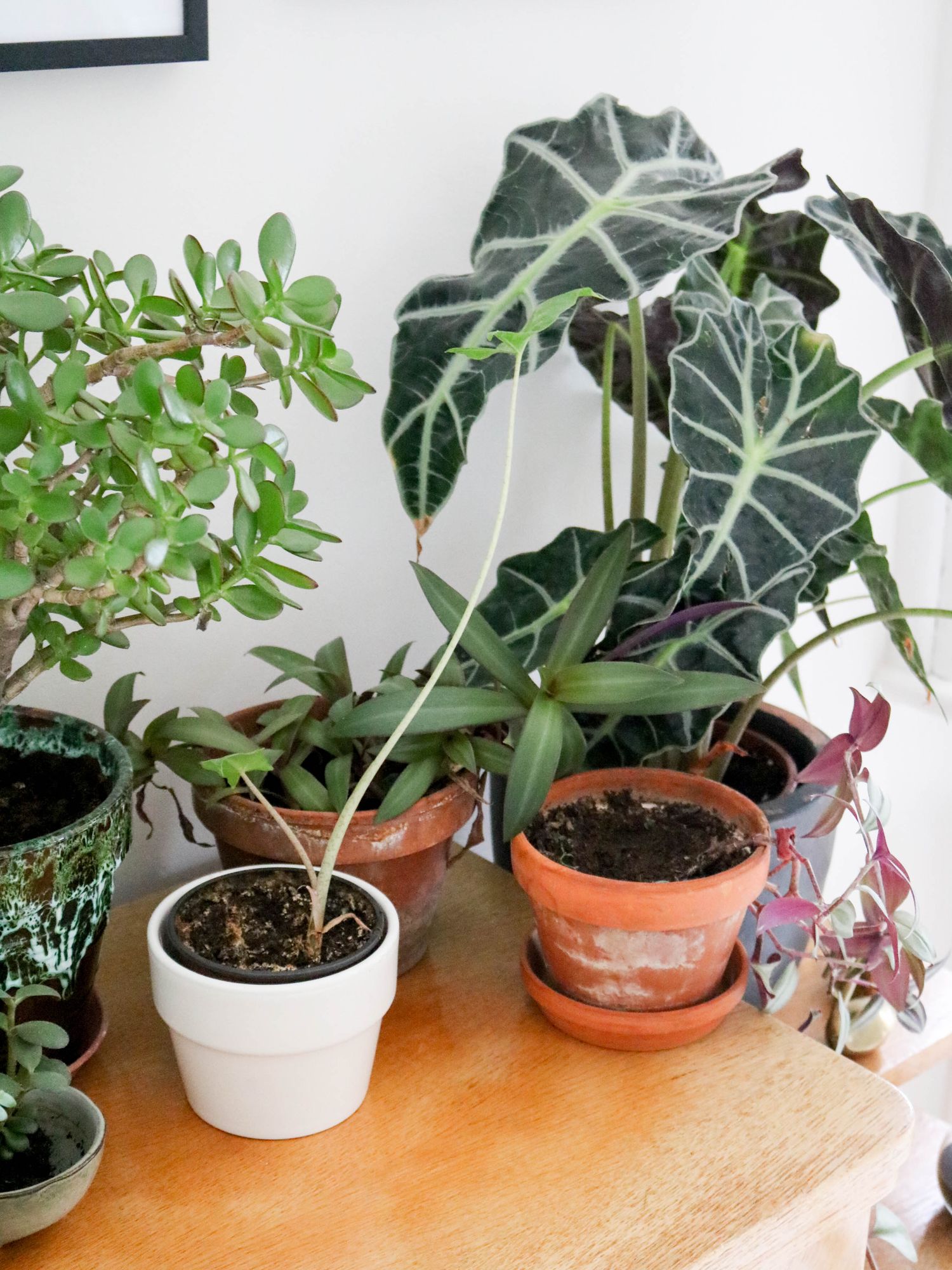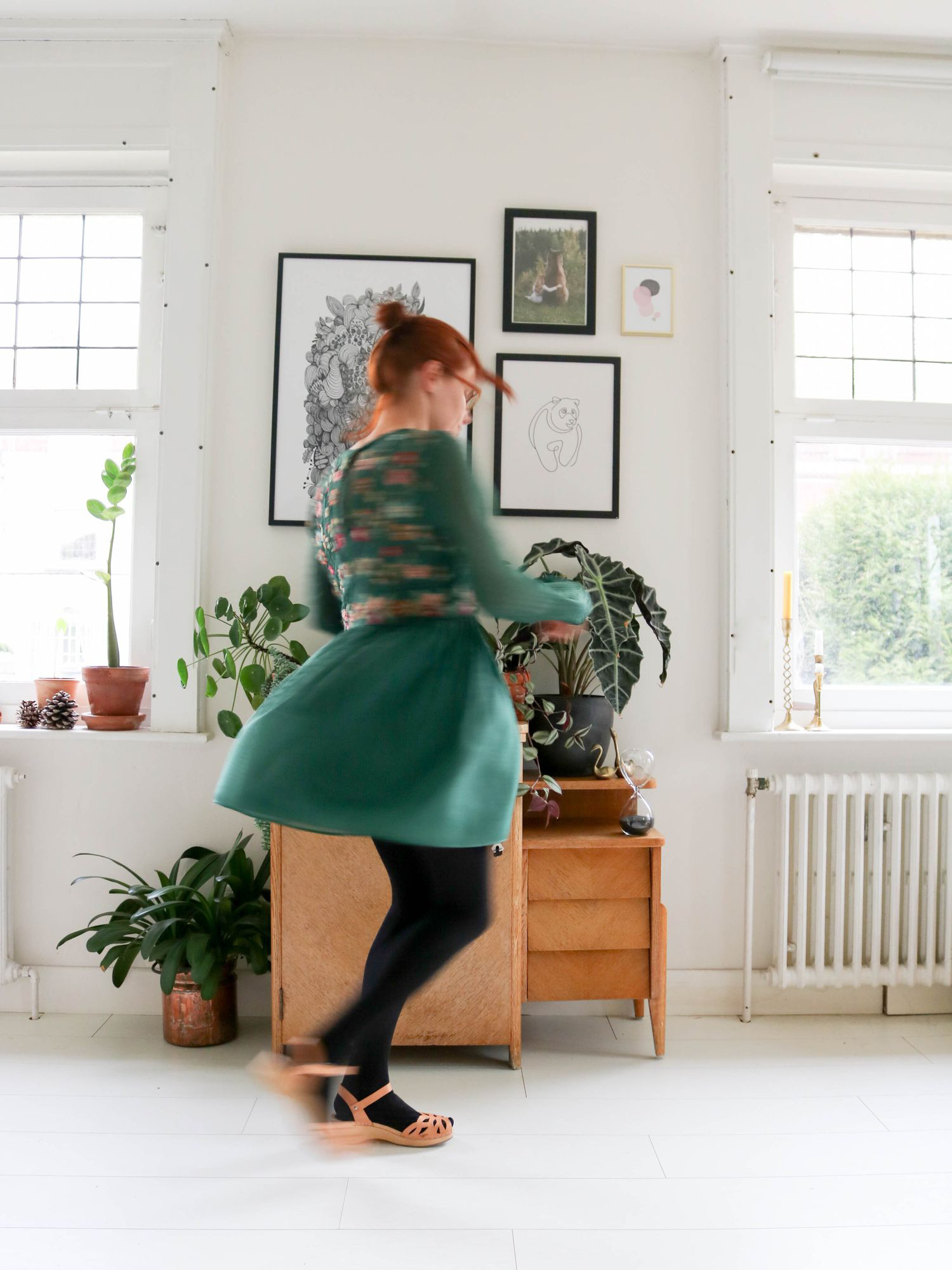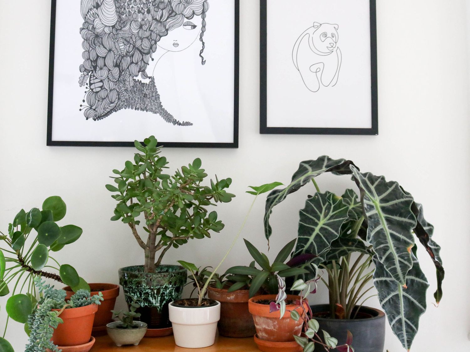 Après avoir installé ce petit meuble de couture vintage entre nos deux grandes fenêtres, j’ai disposé mes plantes préférées: la pilea peperomiodes, l’arbre de jade ou l’alocacia amazonica. Il restait le mur à décorer, une chose était sûre: je voulais y mettre des cadres. Moins qu’avant mais des pièces choisies pour longtemps et qui peuvent migrer facilement d’une pièce à une autre.