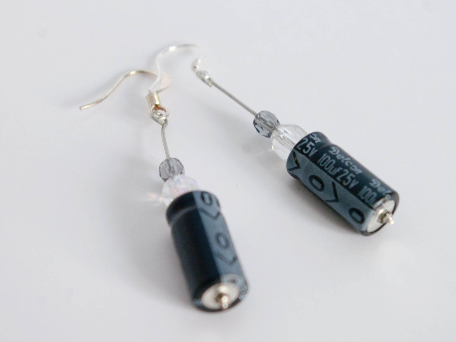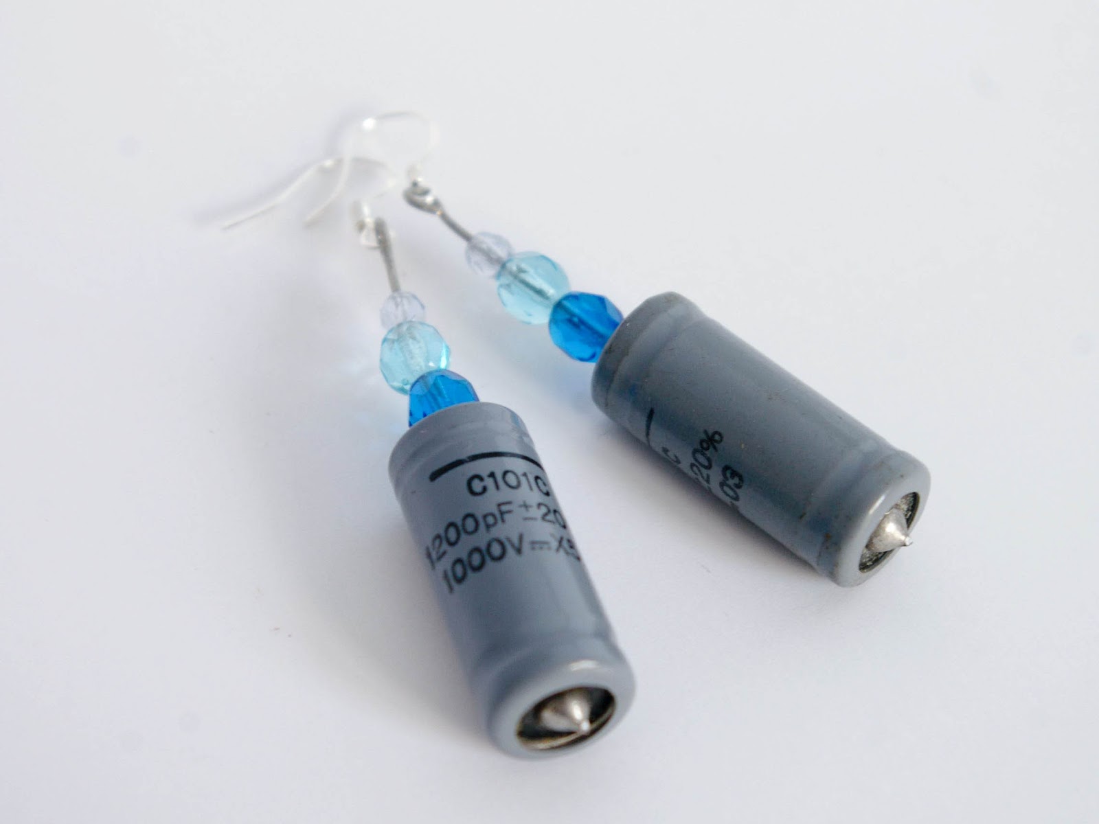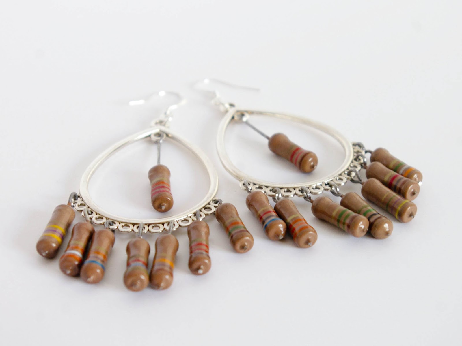 Donc me voici avec un stock de ces petites résistances, condensateurs… j’avais déjà fait des boucles d’oreilles il y a quelques mois avec les composés bleus. Et voici donc une nouvelle fournée que je trouve vraiment sympa!
