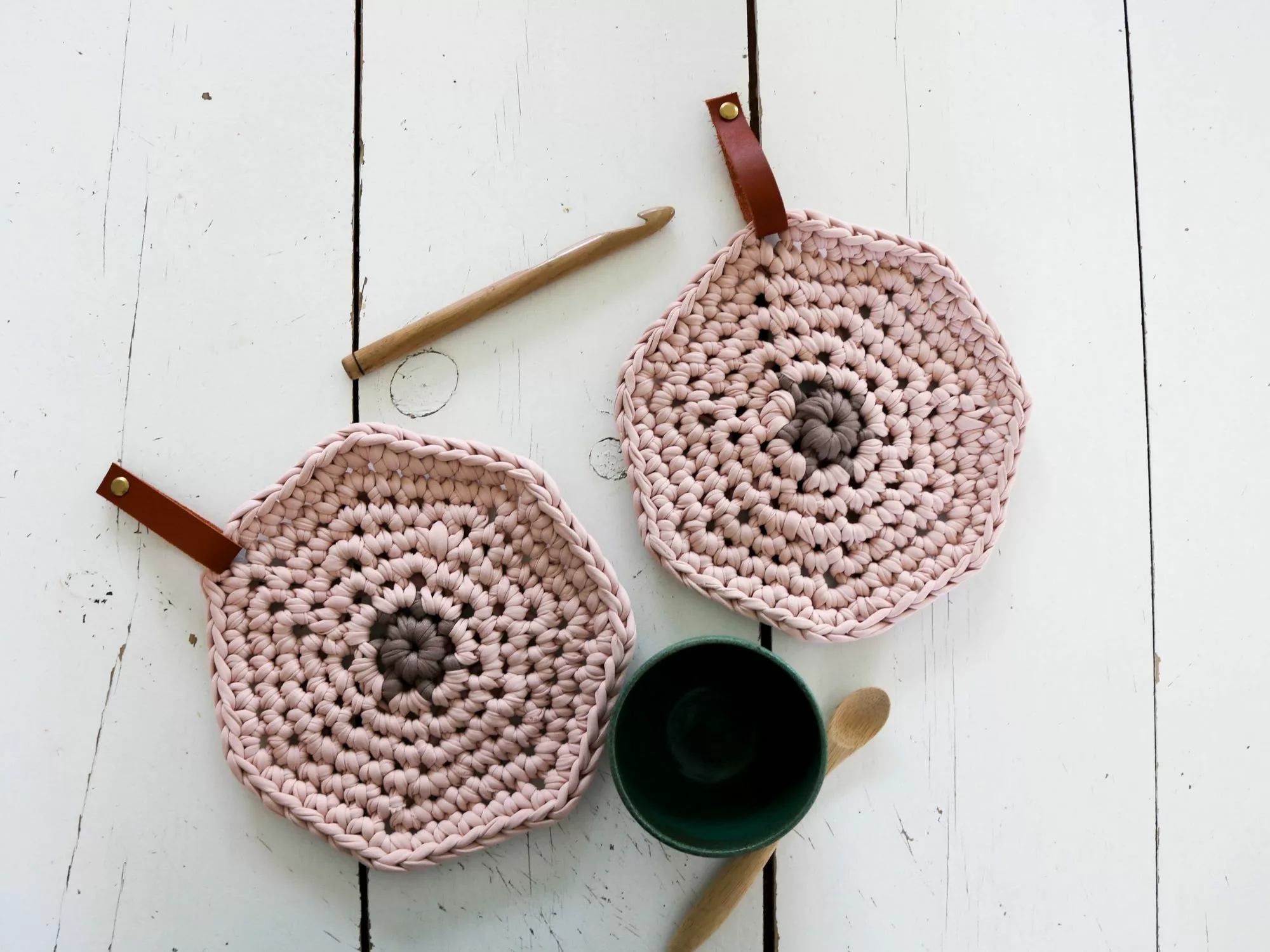 Je vous propose aujourd’hui mon patron de ces dessous de plats très féminins. A faire par paire ou en solo pour offrir ou garder pour soi 😉 égoïstement dans sa cuisine ou ailleurs (je ne veux pas savoir 😉 ).