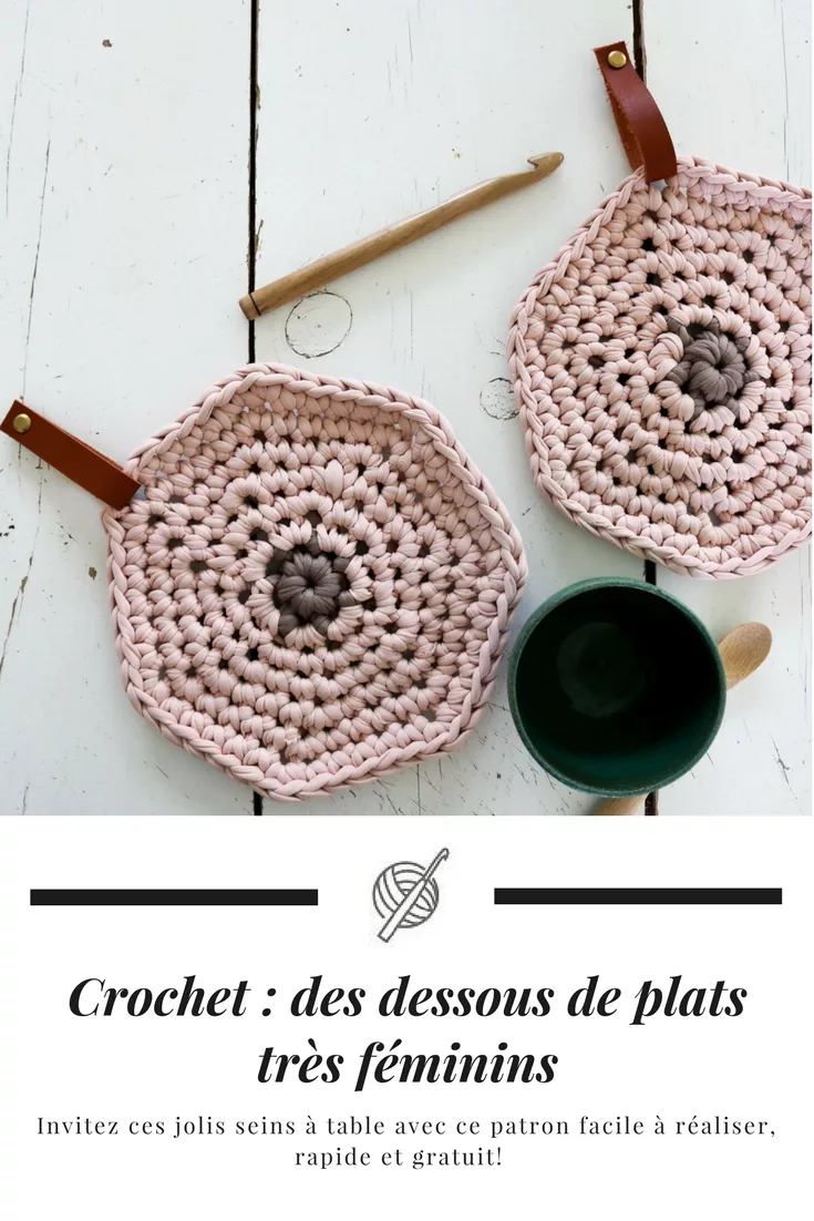 Je vous propose aujourd’hui mon patron de ces dessous de plats très féminins. A faire par paire ou en solo pour offrir ou garder pour soi 😉 égoïstement dans sa cuisine ou ailleurs (je ne veux pas savoir 😉 ).