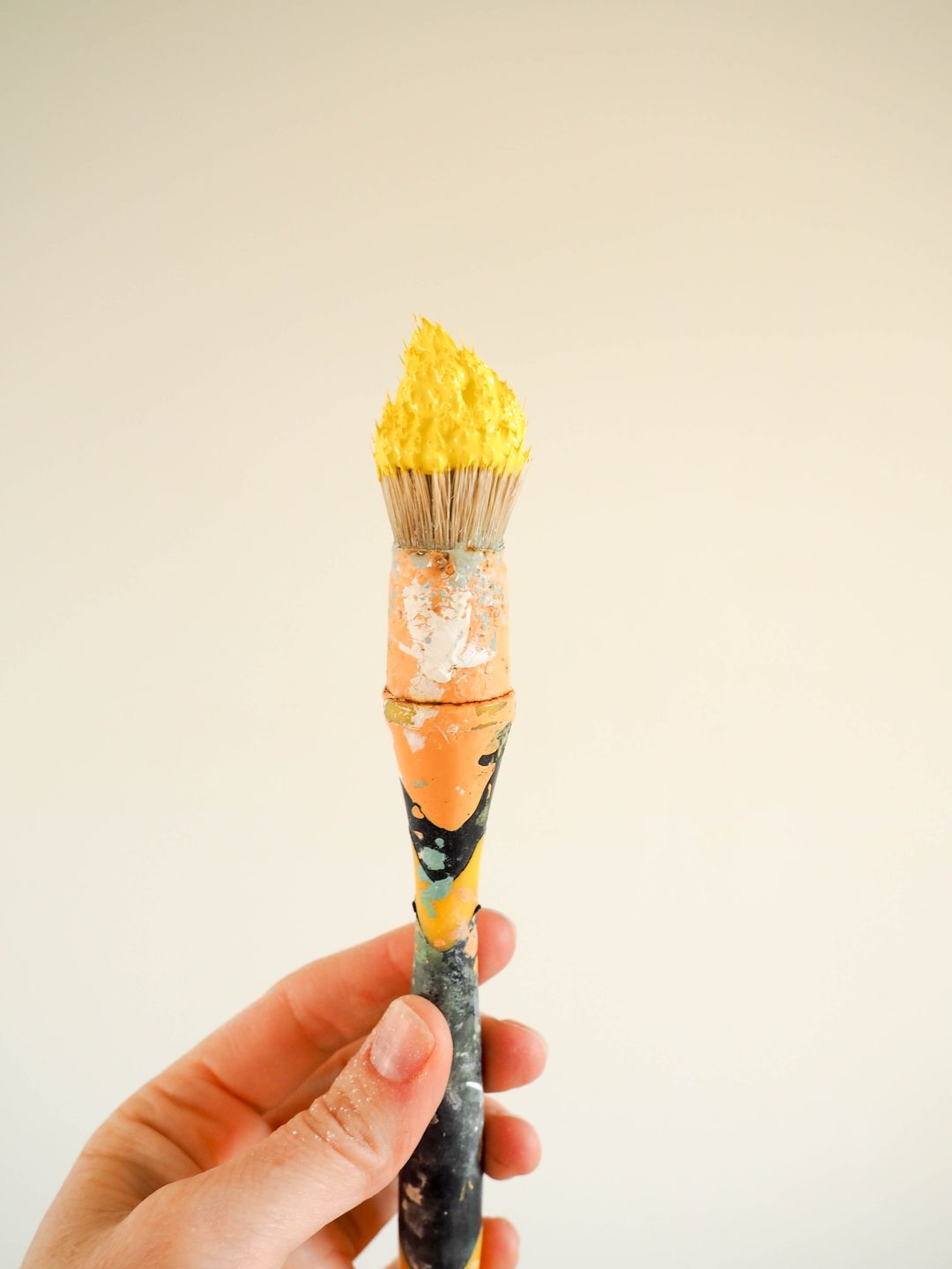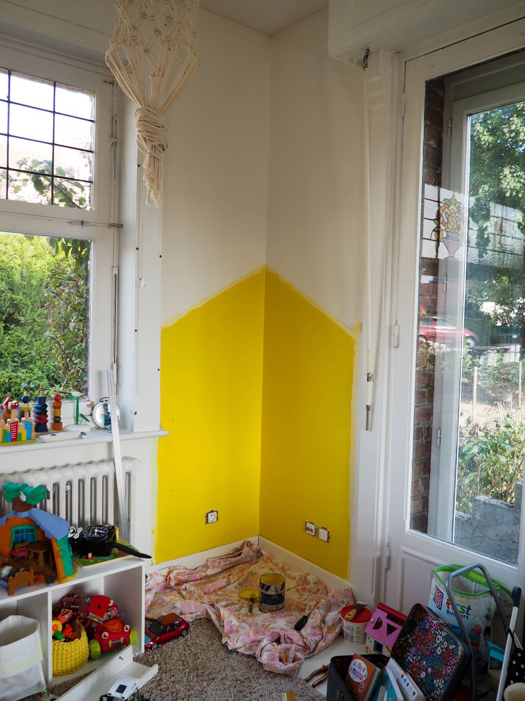 Étant en panne d’idées, Anne-Sophie m’a proposé de peindre une maisonnette entre mes deux fenêtres. Ce projet peinture tombait à pic car j’ai un petit stock de pots à terminer dont ce jaune pétant.