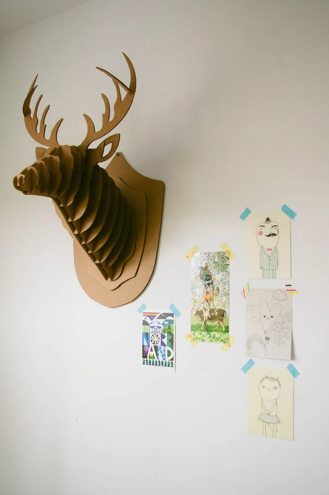 Il neige, je prends des photos, je monte (enfin) ma tête de cerf en carton, je vous montre la planche à découper en forme de nuage de Caroline Gomez que j’ai gagné sur le blog de Kutch et Couture (j’ose pas l’utiliser tellement elle est belle!), je vous montre mes aimants demi-animaux que j’ai fait, mes affiches et le ukulélé de chéri.