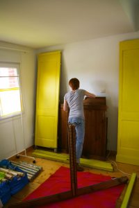 Et puis il m’a pris une envie soudaine de tout bouger dans la maison… surtout par rapport à mon atelier. J’ai besoin d’un espace fixe pour créer, j’en ai marre de “camper” à chaque fois que je dois couper un bout de tissu ou emballer un colis. Donc la chambre d’amis se transforme peu à peu en chambre d’amis + atelier (exit le lit deux places qui ne servait qu’occasionnellement). Bientôt, vous verrez tout ça en image.