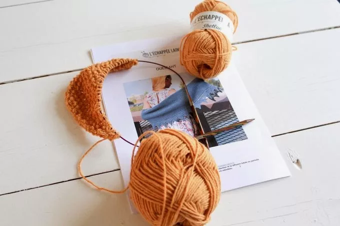 En ce moment j’ai sur mes aiguilles ce joli châle Ouessant proposé par l’Échappée Laine.
