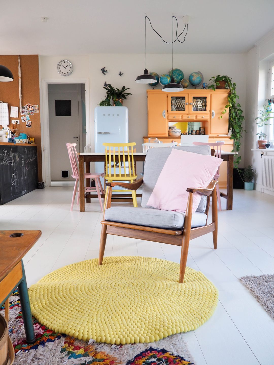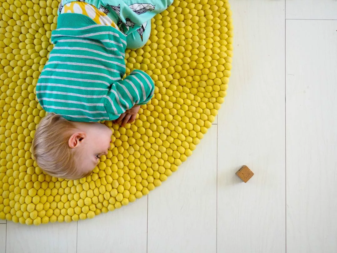 J’ai choisi un tapis rond de 100 cm de large, presque l’ensemble des tapis sont personnalisables, couleurs, tailles et formes, un vrai plaisir! Nous avons choisi un tapis rond de boules jaune soleil et il porte bien son nom car il illumine notre salon. Comme il est de petite taille, notre tapis voyage dans la maison. Il se déplace du salon au coin jeux de Loup jusque dans sa chambre.