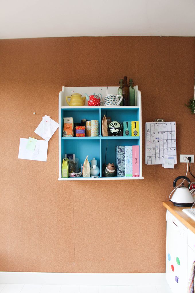 Après le mur en papier peint vintage, voici donc le mur en liège de la cuisine et issu du recyclage des bouchons !J’ai donc choisi un rouleau de liège de 10 m² en 5 mm d’épaisseur (pour punaiser) et un pot de colle de 2.5 kg.Ce liège est adapté pour réaliser des tableaux d’affichage.
