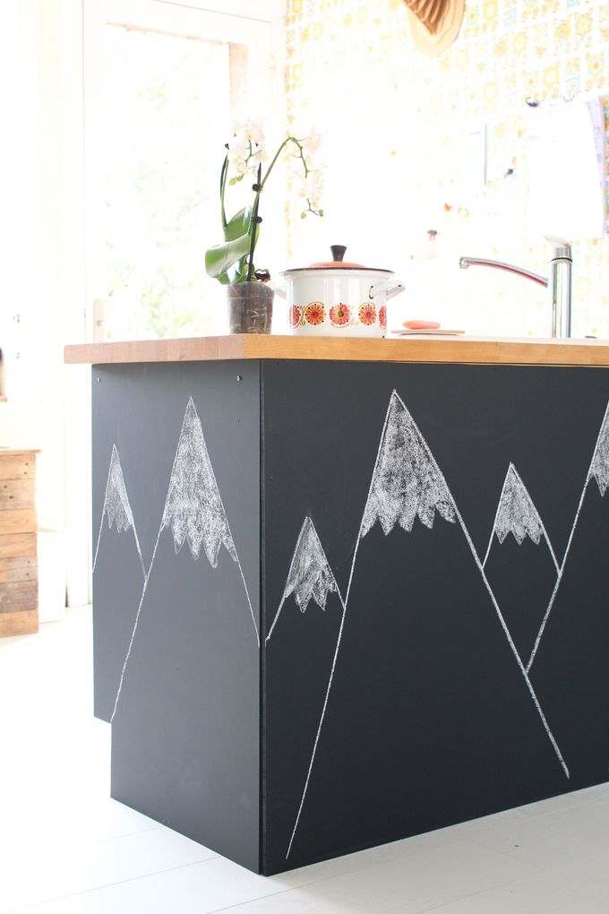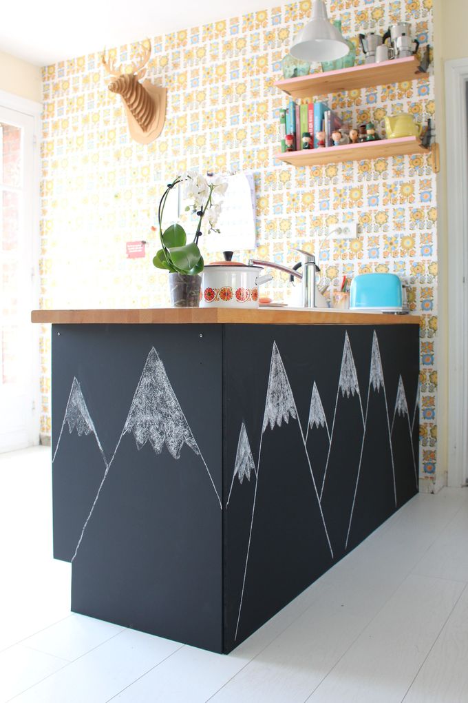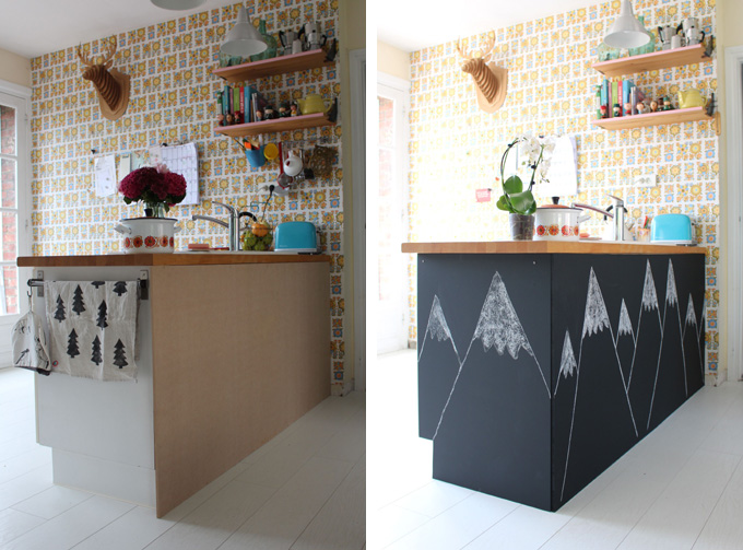 J’ai utilisé tout d’abord du médium 10 mm (que l’on trouve en magasin de bricolage à la découpe) pour recouvrir mon ilot. J’ai ensuite appliqué la peinture ardoise couleur noire. Après 2 couches d’une peinture agréable à utiliser, j’ai dessiné des jolies montagnes sur notre beau tableau noir que Loup s’est empressé d’étaler.